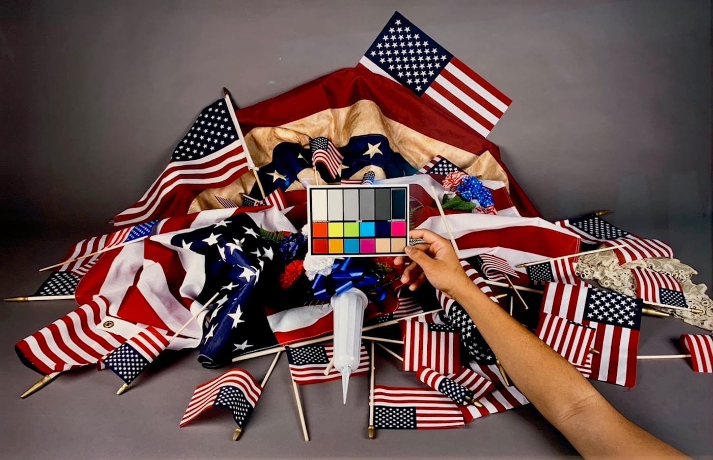 Artist Stephanie Syjuco was an easy favorite of the press preview and VIP crowd. Ryan Lee gallery is showing a carefully curated selection of her probing photographs, which riff upon clashing concepts of America and current events. The San Francisco-based Filipino artist specializes in finding the artifice of everyday life and then making that the focus of her work. In her images, couples face their back to the camera, cloaked in green screen outfits. She creates applicant photos with migrants who shroud their faces in cloth. The checkered Photoshop pattern appears on a blanket that’s draped across a figure’s entire body; it’s like a request for anonymity or deletion. My favorite of all is Syjuco’s “Color Checker (Pileup)” (2019), which features a still-life of patriotic paraphernalia in the background and a rainbow ColorChecker card thrust into the foreground by the artist’s hand. At a moment when the politics of white nationalism threatens to engulf America, it’s hard not to see the colorful checker card as a reminder of our nation’s diversity. What other colors are hiding behind red, white, and blue?
