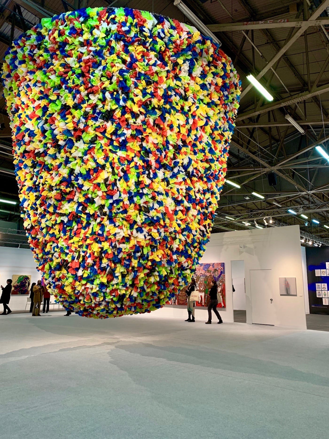About halfway through my tour of Armory Show 2019, I encountered the gigantesque and hollowed-out sculpture “Plastic Bags” (2019) by Cameroonian artist Pascale Marthine Tayou. Nearby, an overeager gallery attendant explained to a small crowd of glittering culturati how this work speaks to the pollution seen in developing countries. With the exactitude of the artist’s Wikipedia page, she informed her high-net-worth listeners that Tayou wants to “redefine postcolonial culture and raise questions about globalization and modernity” with his work. It also looks really cool from the inside. Cut to the next scene: a woman shoves her french bulldog underneath the sculpture for the perfect Instagram photo as another woman in leopard print edges into the frame.