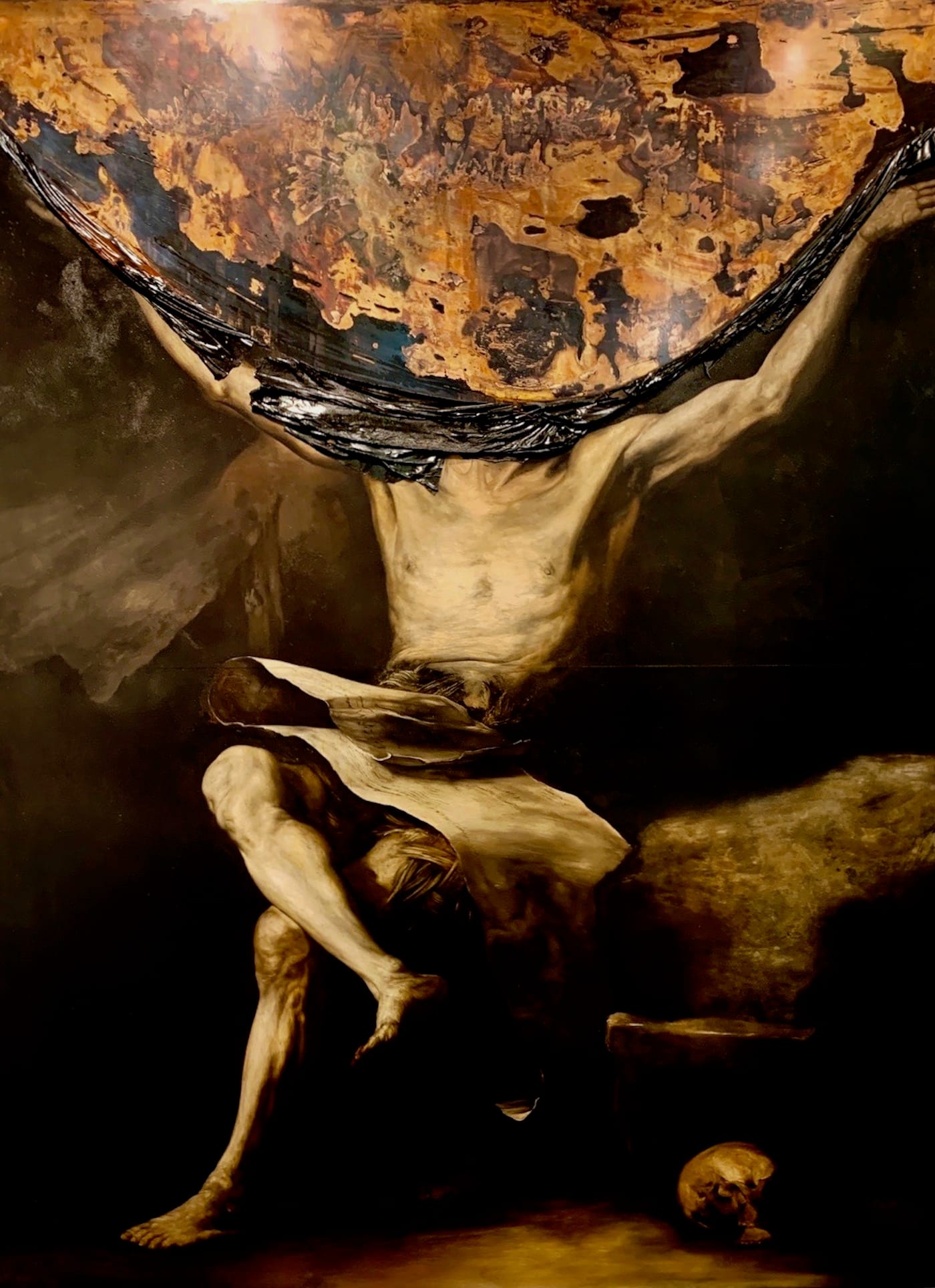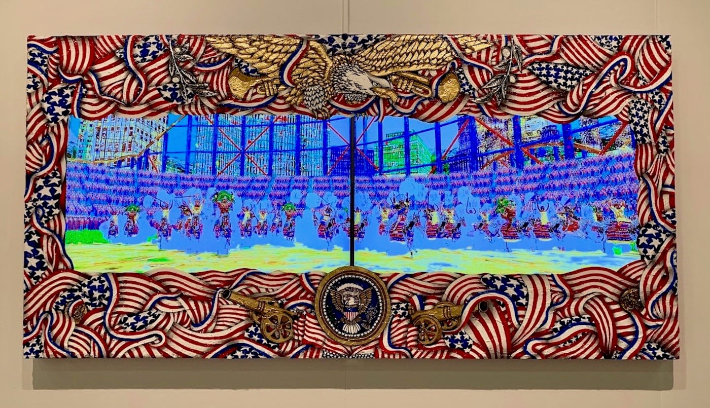 Another impressive exhibition of political commentary was Federico Solmi’s orgiastic nightmare video-painting hybrids, on view at Ronald Feldman Gallery’s booth in Pier 94. The Brooklyn-based artist twists reverence for the Founding Fathers into a carnival masque of unwieldy ghouls. There is a childlike essence to the work, which collapses American iconography with a Nickelodeon palette of neon pinks and booger greens. Even his frames burst forth with cartoonish (but pertinent) juxtapositions: skyscrapers and rollercoaster tracks, Mount Rushmore and King Kong, Las Vegas and Washington DC. In one work by Solmi, “The Grand Masquerade” (2018), we see battalions of Native Americans and colonists fighting inside a football stadium.