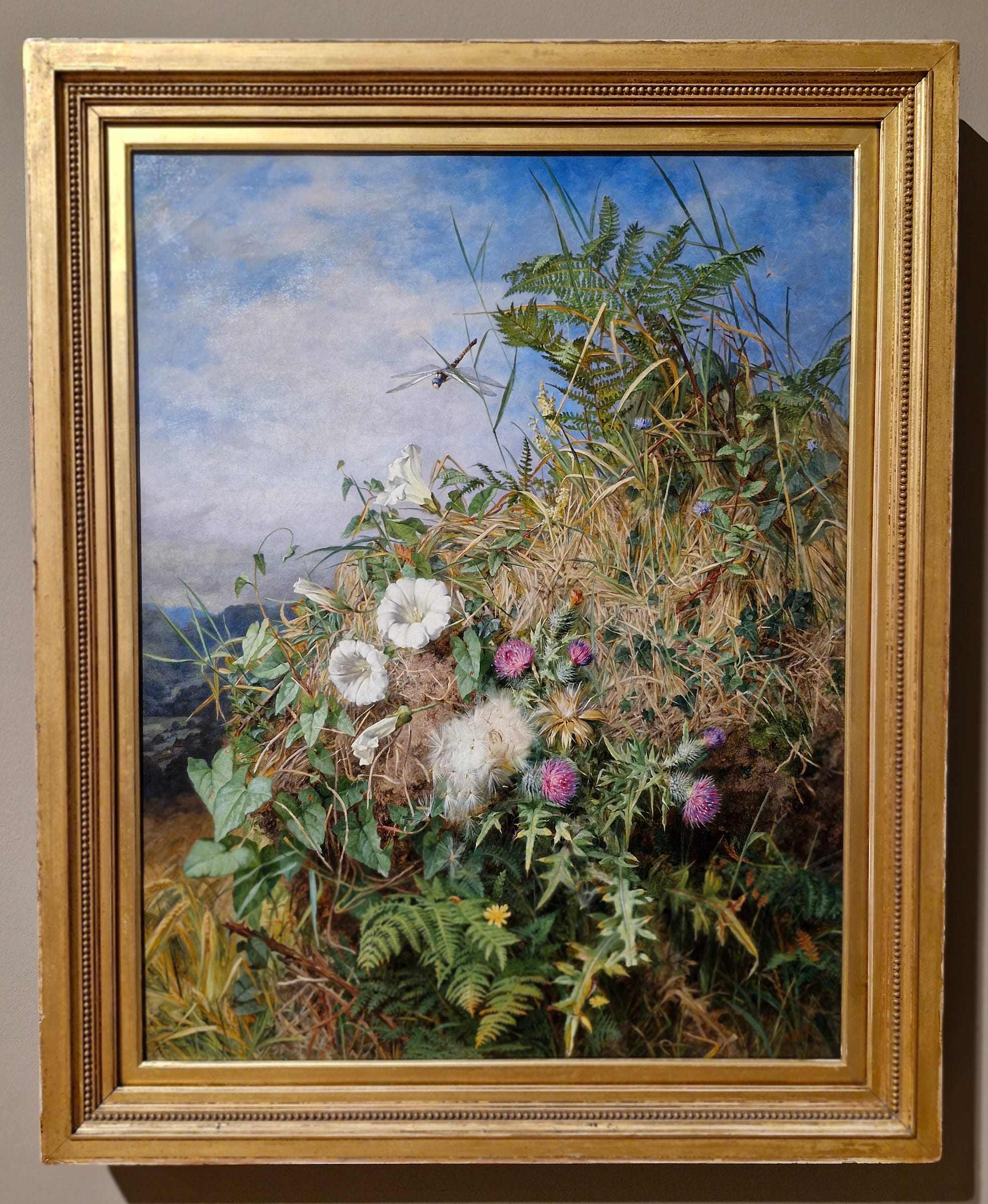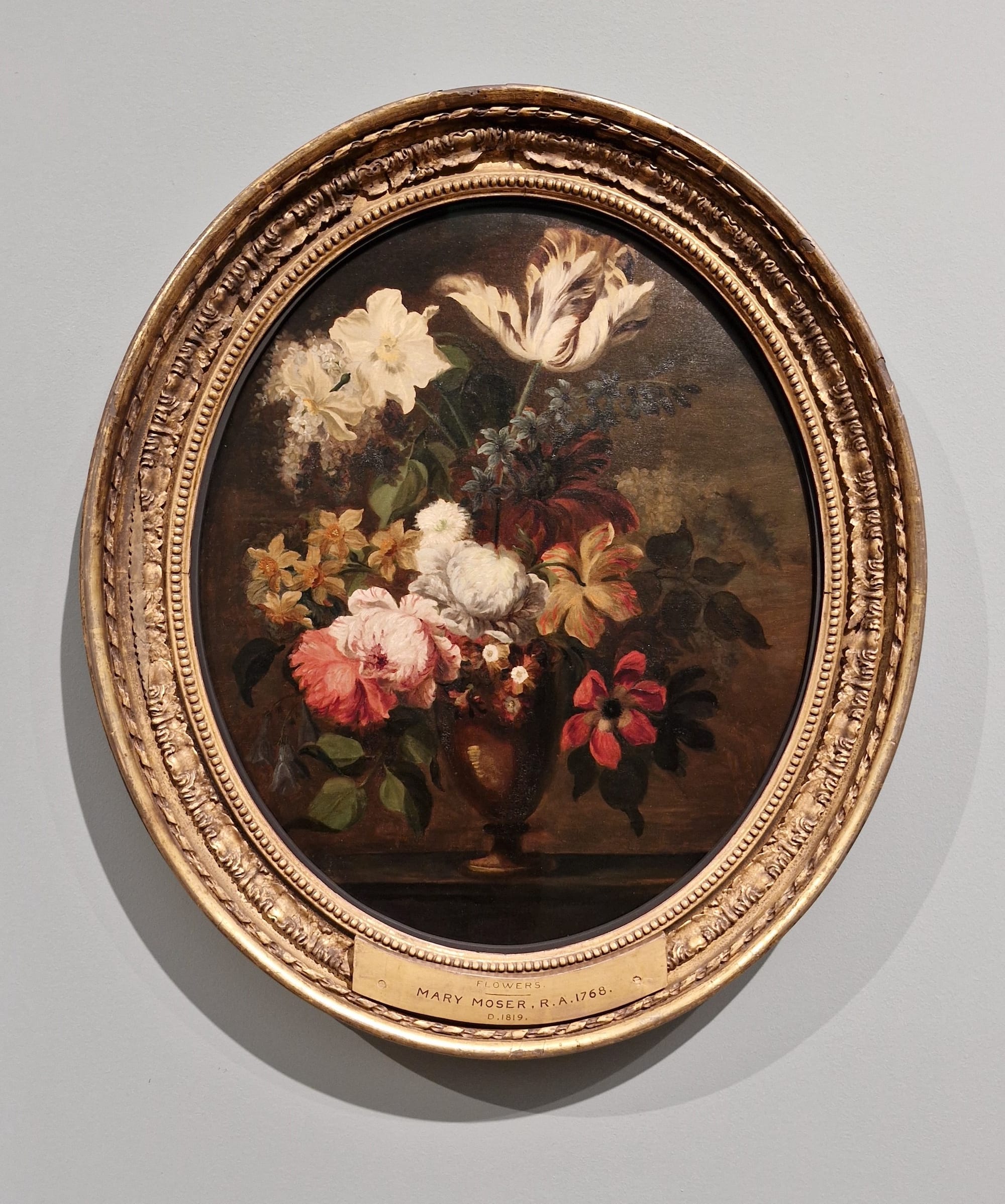 Kauffman recently enjoyed a survey at the Royal Academy that established her as an exception to the rule due to a combination of social factors and venturing into the lofty arena of history painting — usually reserved for men. Fellow Academy founder Mary Moser was not so daring, and focused on painting flowers. Indeed, subjects such as flowers that were deemed suitable to women spanned media and genres. An entire room dedicated to flower imagery details how women found work as botanical illustrators. Even fabulous examples, such as Martha Darley Mutrie’s “Wild Flowers at the Corner of a Cornfield” (c. 1855–60), an apparent response to John Ruskin’s criticism of works by the artist and her sisters at the Royal Academy in 1855, according to the caption, are denied entry to the art history annals simply by their subject matter.