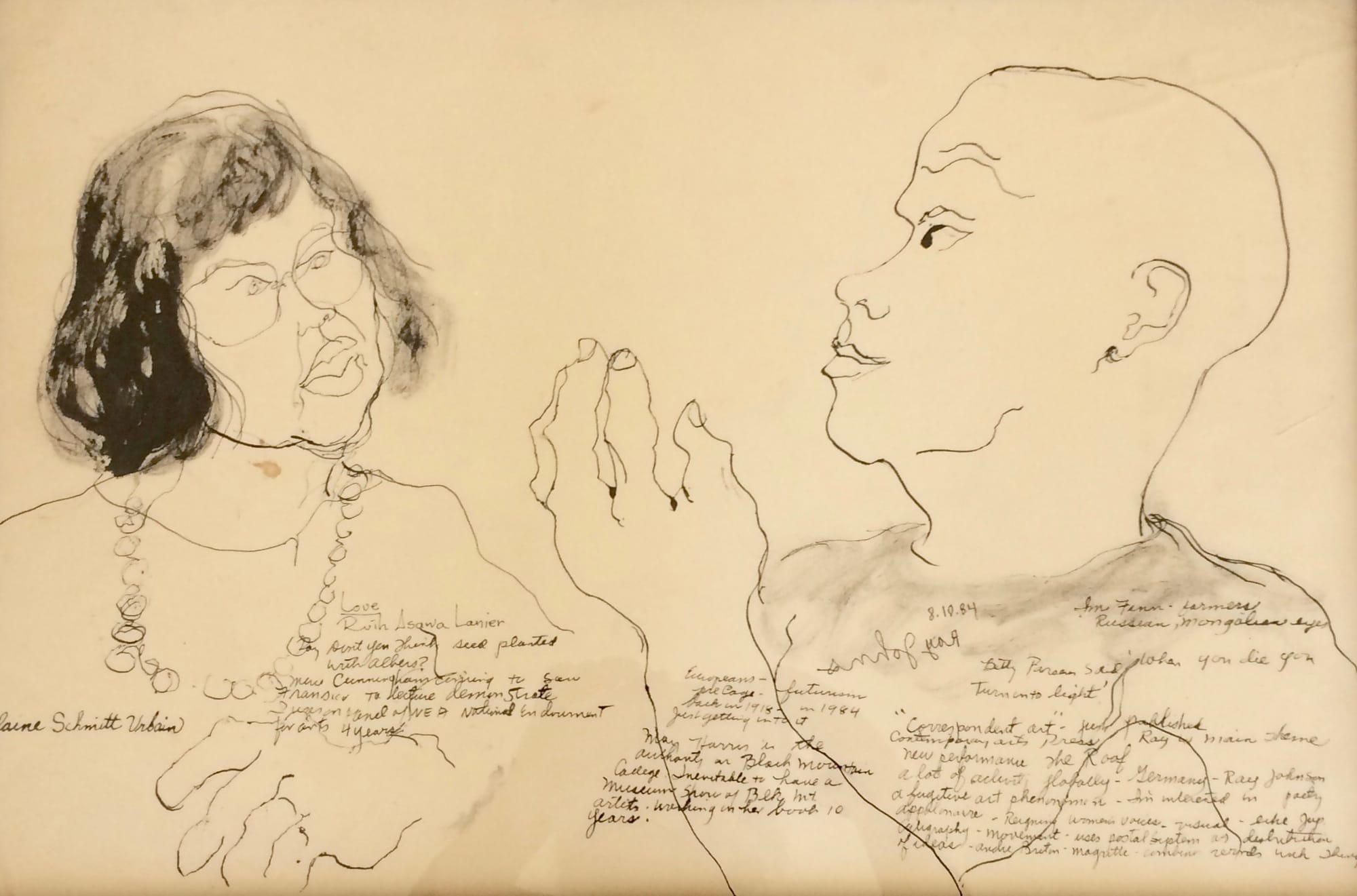 M.C. Richards, a nationally acclaimed poet, taught writing and literature but was also a pottery student under Karen Karnes. Richards participated in what may have been the first Happening in 1952, collaborating in a staged but improvisational event with John Cage, David Tudor, Robert Rauschenberg, and Merce Cunningham, among others. Elaine Schmitt Urbain captures her remarkable spirit in an informal sketch.