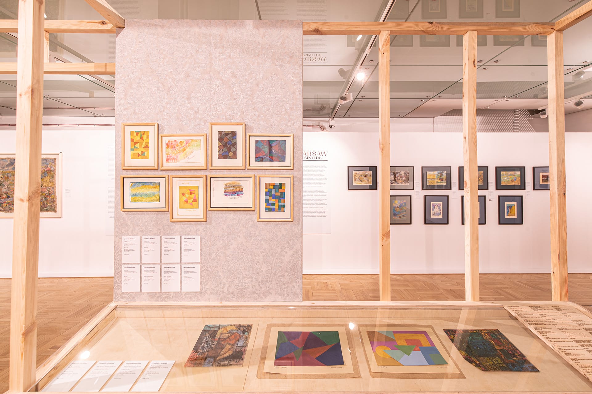 This is particularly evident with Płonkowa, whose legacy has been best preserved out of the four artists as she bequeathed many of her works and documents to the Ethnographic Museum. Płonkowa’s unabashed and unrestrained artistic exploration — generously described by the curators as “unusual versatility” in the wall text — is on full display here. Paintings on glass, watercolors, and charcoal sketches hung salon style in a makeshift wooden structure in the middle of the room depict everything from religious iconography and scenes from folktales, to abstract patterns and detailed botanical sketches. This is an explosive celebration of almost childlike experimentation and wonder, and the viewer feels as though they are witnessing Płonkowa searching for a language with which to express her world. Whether or not it is intentional, the wooden structure devoted to Płonkowa’s work emphasizes this feeling of constructing a space to explore and dream — to imagine and create a world separate from both the constraints of the commercial art world and also the horrors of the past.
