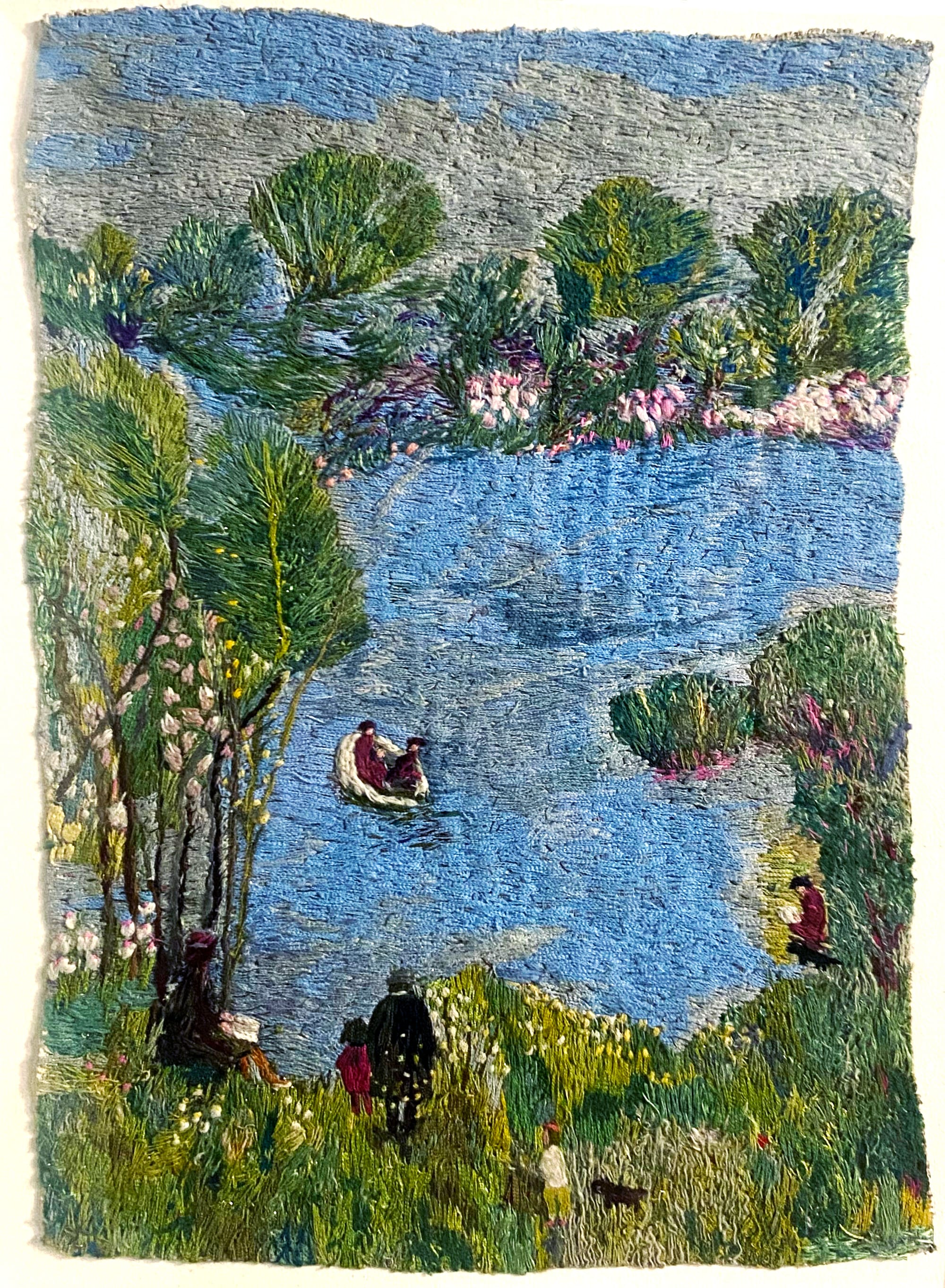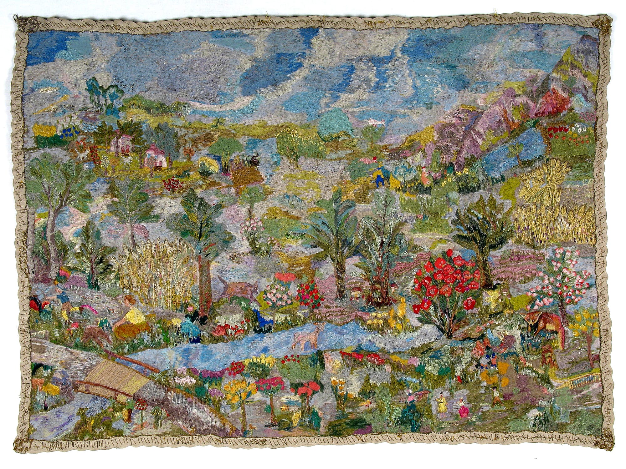 At first glance, the cheerful and colorful scenes these artists created in their '40s and '50s seem to belie the reality of their lives. After spending some time with their works, however, another possibility arises — for these women, the pursuit of art was an exercise in worldbuilding, using their distinctive styles to construct an alternate reality. Płonkowa often painted imaginative fairytale scenes, including one featuring a grasshopper playing the violin to an audience of gnomes, and another of a snow queen on her throne. Consider also the dreamlike world of Walicka, whose ethereal women seem to float in their long dresses, with winds pushing them through outdoor and domestic settings that at times resemble theatrical sets. Even the urban landscapes of Korsak and Mickiewicz — some of which are so detailed they resemble actual locations in Warsaw — are imbued with a sense of wonder. Mickiewicz’s embroidered landscapes, enhanced with sparkling silver and gold threads, suggest an otherworldly dimension.