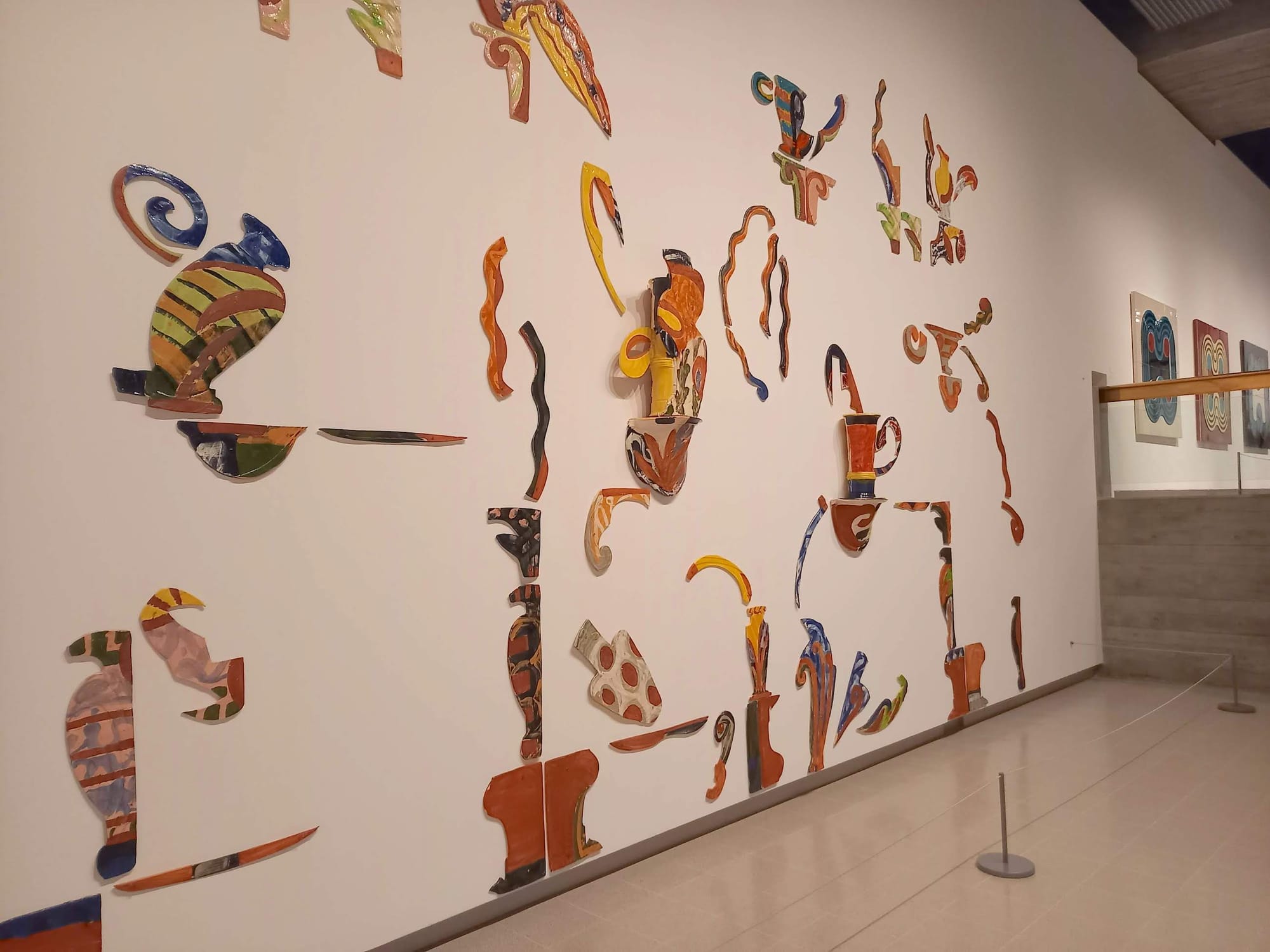 In recent years the resurgence of painting in contemporary art has been repeatedly proclaimed, and only a year ago the same venue hosted Mixing It Up: Painting Today, which similarly presented a global snapshot of innovative artists. Clearly the Hayward’s programming agenda suggests that clay has just as much potential as painting — amply demonstrated by a range of examples. American Betty Woodman’s “House of the South” (1996) presents an interplay between the dimensions: two-dimensional silhouettes of ceramic jars and fragments cut out in clay, glazed in simplified, imprecise pattern, are scattered flush to the wall in an arrangement emulating a three-dimensional scene. The caption states that Woodman was inspired by the trompe l’oeil effects of Roman frescos; the sophistication of her interpretation sneaks up on us.
