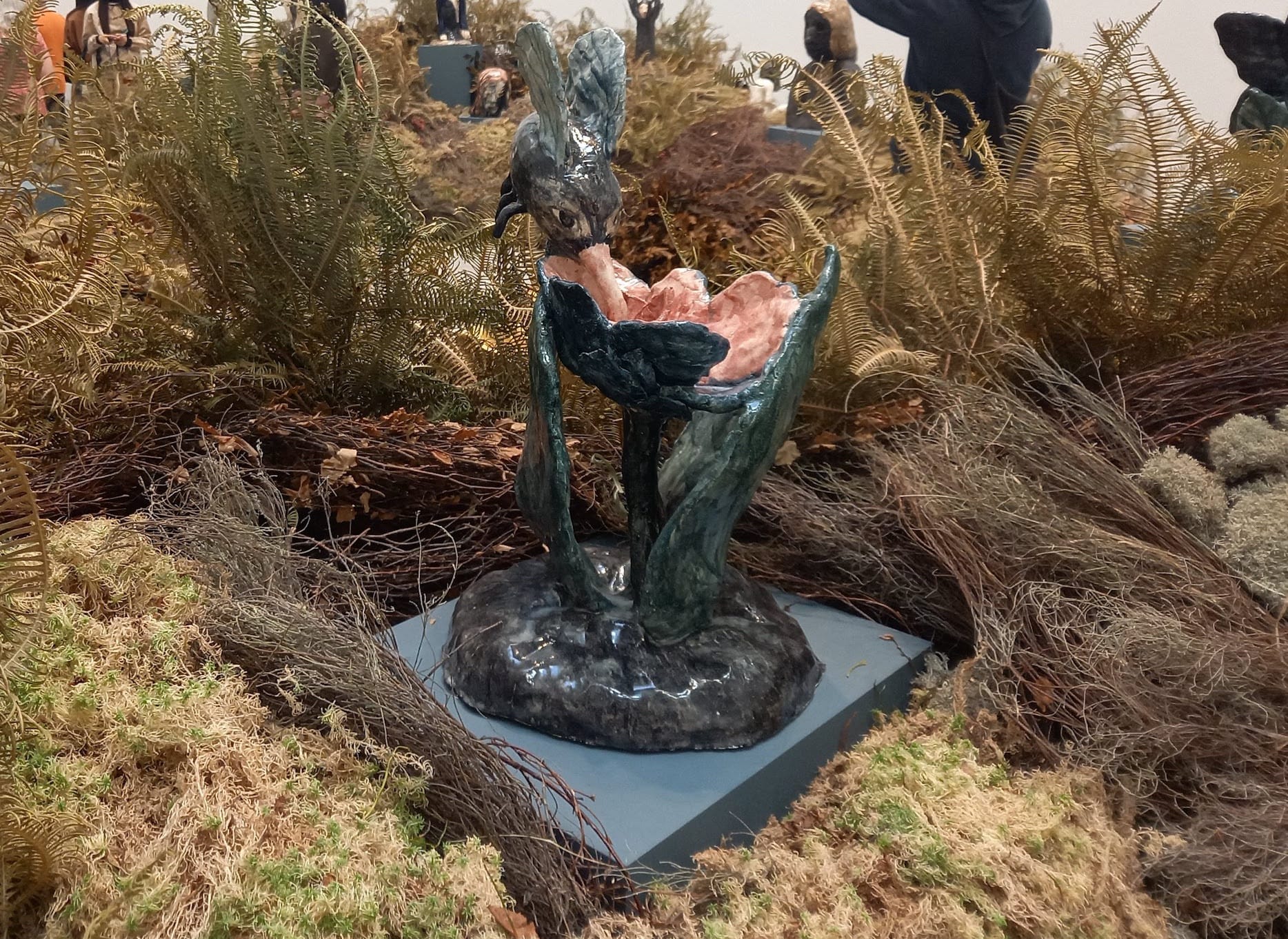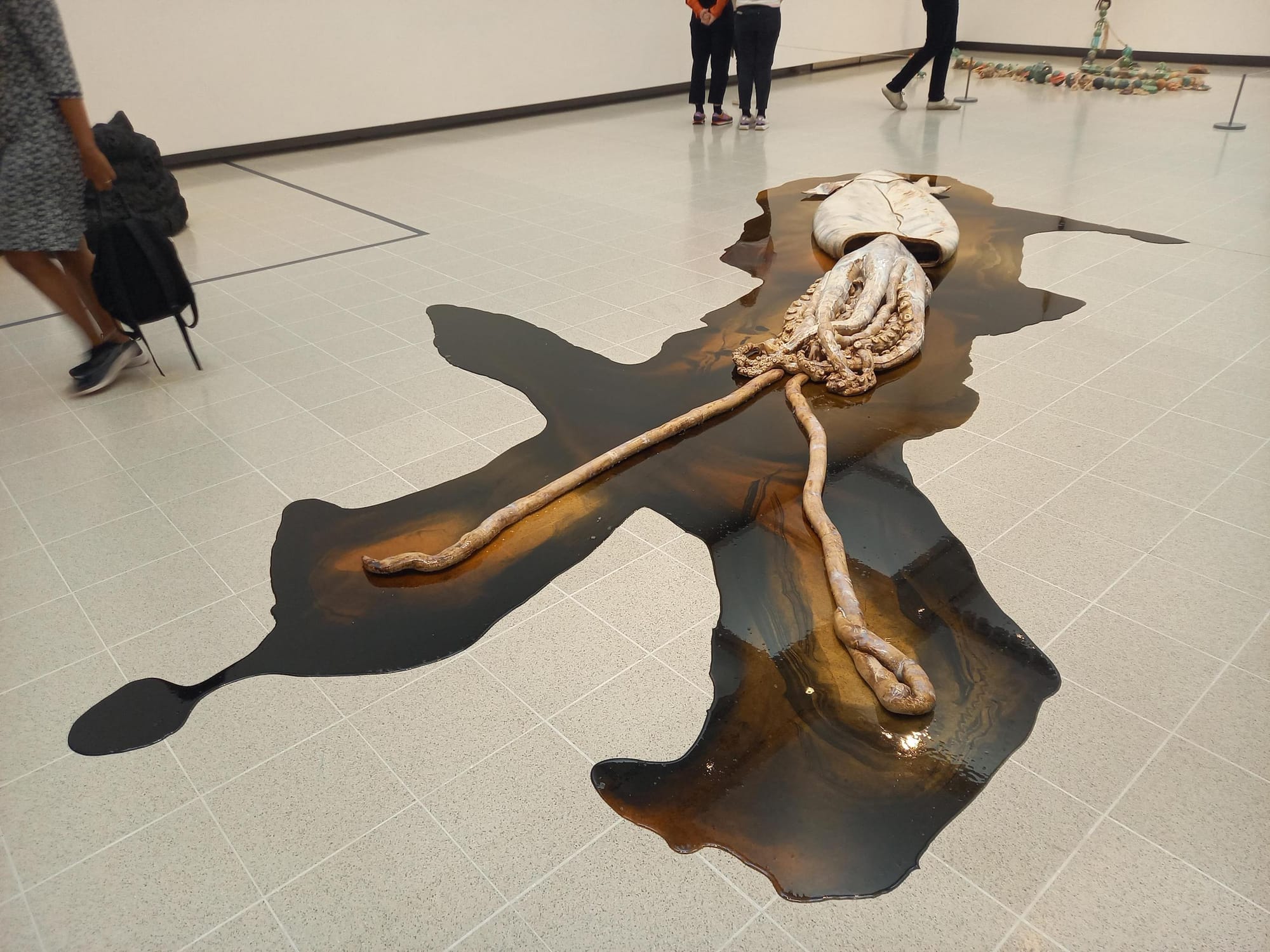 Similarly, the show reflects a spectrum of conceptual invention; arguably Iran-born Shahpour Pouyan’s conceptual process behind his “My Place Is the Placeless” (2017/2022) is equally importance to its physical construction. In 2014 he took a DNA test that revealed an ancestry originating from 33 countries, and subsequently produced a series of clay “roofs” inspired by the historical architecture of each. Less rooted to strict methodical procedure is Peruvian David Zink Yi, whose “Untitled (Architeuthis)” (2010) is a five-meter-long giant squid sprawling across the gallery floor. The giant squid had never been encountered live by humans until some deep sea photography in 2004, resulting in an almost mythical status; Zink Yi notes how fascinating it is to know of a creature we have only ever seen dead, washed ashore. The caption describes it “[evoking] the realms of myth and alchemy and reflects on the fragile boundaries between sea and land, familiar and strange, life and death.” Though Lauson may not have intended the association, the brown pool meant to signify the squid’s ink will undoubtedly evoke oil to many visitors familiar with the recent activities of Just Stop Oil. In this context, the work takes on a topical environmental meaning.