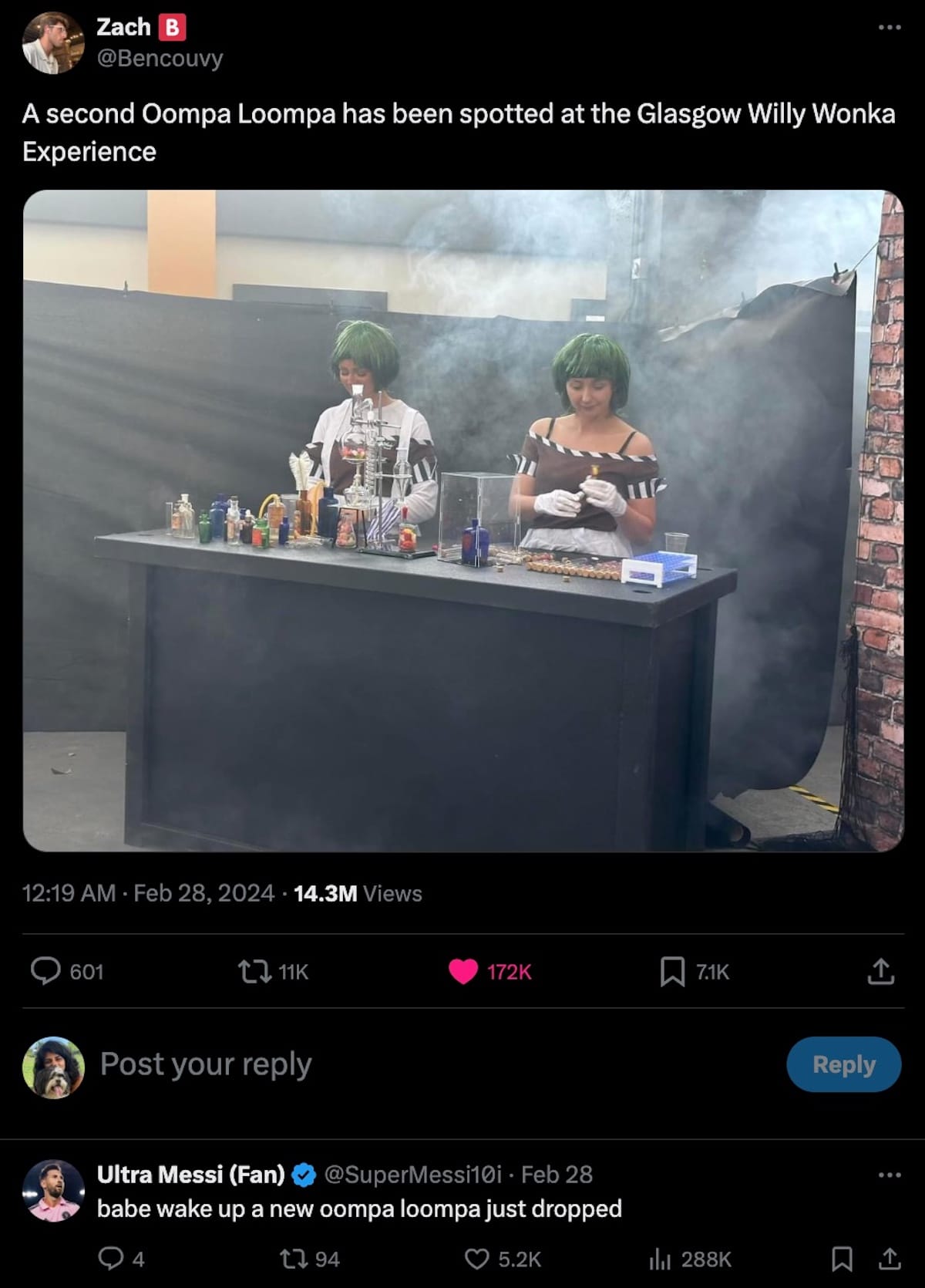 It's also worth noting that despite the event having turned out to be a not-so-Enchanted garden-variety shit show that cost £35 (~$44) a ticket, it was so hysterically, insanely bad it was actually kind of good? I've seen people post in envy of those who were in attendance, and a Change.org petition to "Reopen the Glasgow Willy Wonka Experience" has over 5,000 signatures and counting.