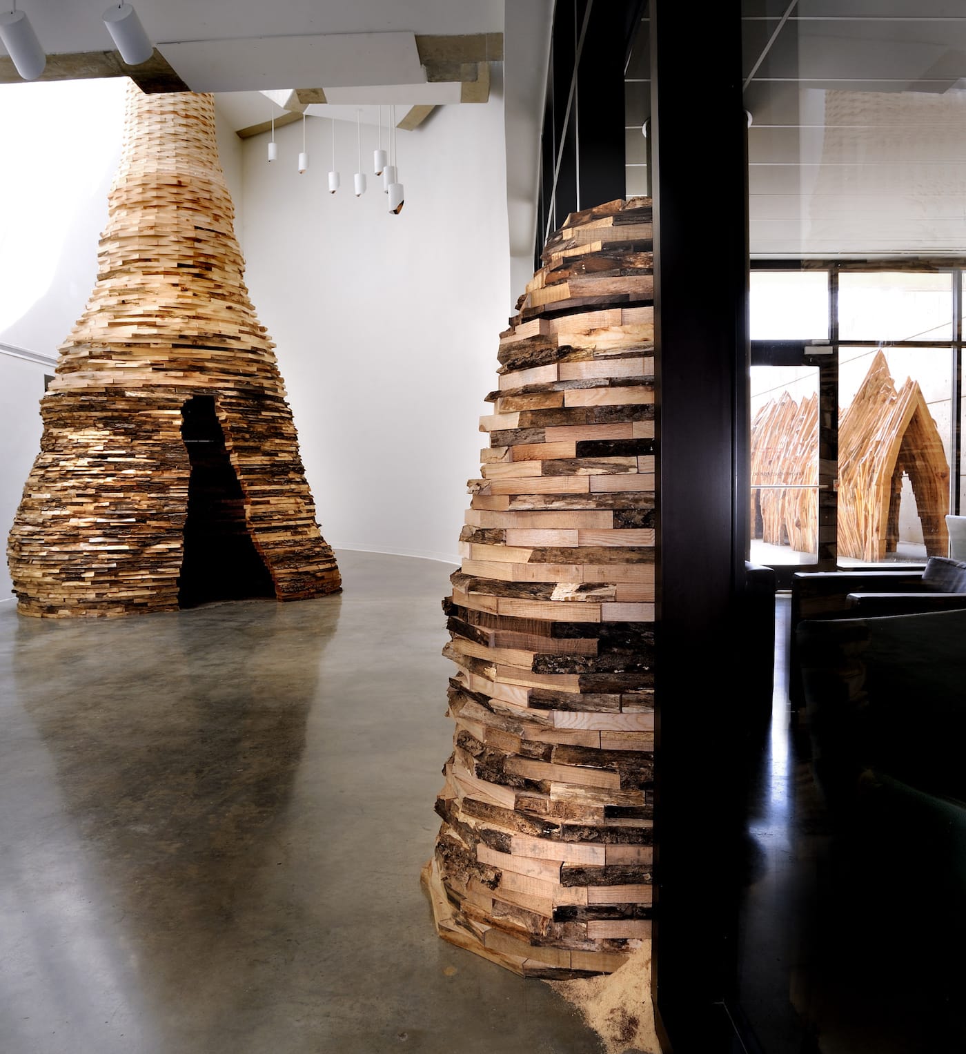 The tower is the most impressive of the group, partially due to its placement, shooting up 36 feet in the space next to the stairway. Visitors can walk into it at the bottom, one or two at a time, and look up at the interior or climb the stairs, winding around the sculpture, to get an overview. The multiple viewpoints are essential to the experience; I felt like a squirrel, first burrowing into the trunk of the tree, then climbing up to its top.