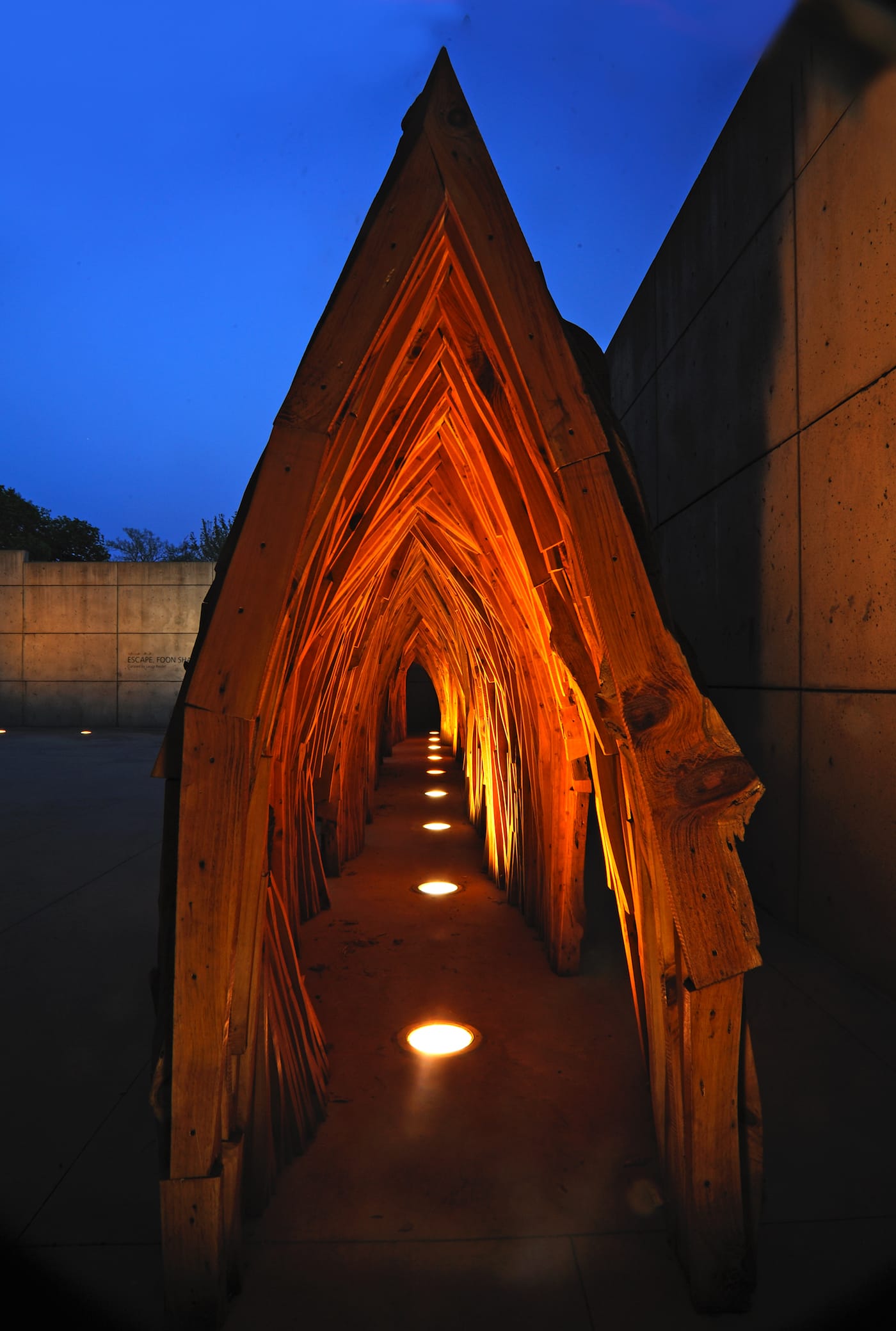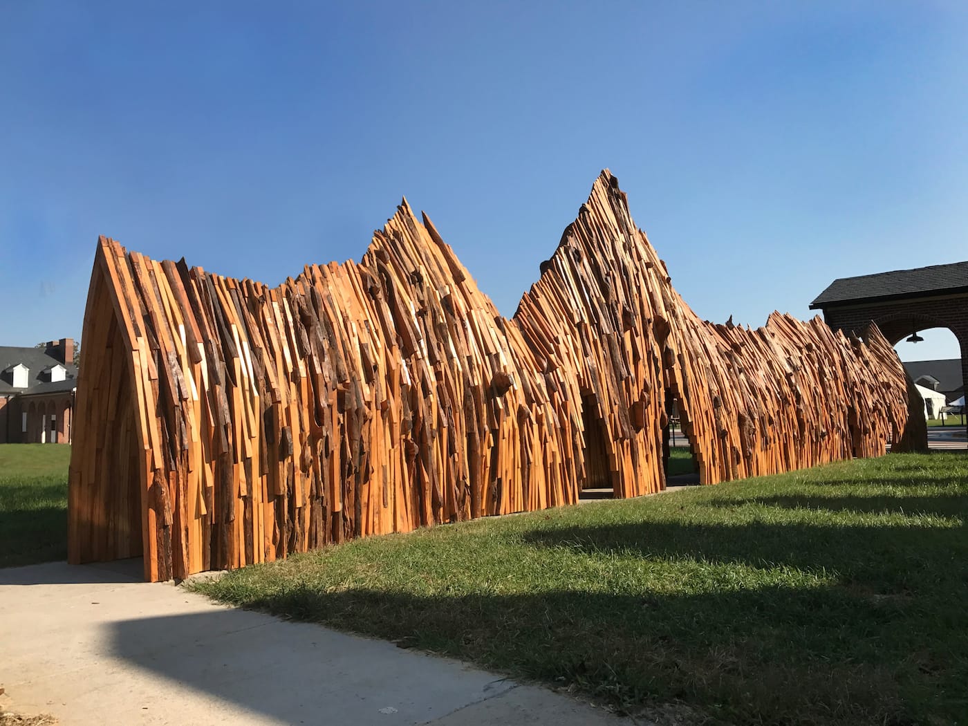 Walking through “Escape I, Tunnel” also makes you feel like a woodland creature, but there is more to it than just the smell of wood after a night of heavy rain, sunlight streaming in to create unique shadows, and multiple holes in the side of the piece, which you can use to duck in and out. The work also references issues of immigration: “The outdoor sculpture’s craggy ridgeline echoes the mountain ranges of the American West and traces the line of the U.S.-Mexico border,” Roulet writes. Of course, it’s also a tunnel, which immediately conjures images of fleeing refugees.