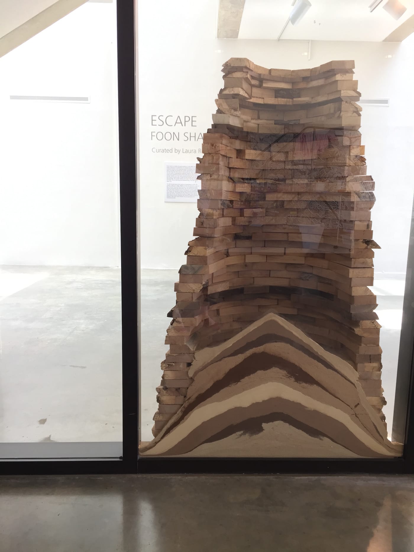 WASHINGTON, DC — Foon Sham’s wooden sculptures often look like large vases or tornadoes. At the American University Museum, he presents three new works, all made from his signature wooden blocks, resembling a giant tunnel (“Escape I, Tunnel,” 2016), a massive industrial chimney (“Escape II, Tower,” 2016), and a small vessel cut in half (“Escape in Dust,” 2017). “Escape II” and “Escape in Dust” are situated in the main gallery space, and “Escape I” is outside, in a concrete courtyard misleadingly called a “garden.”