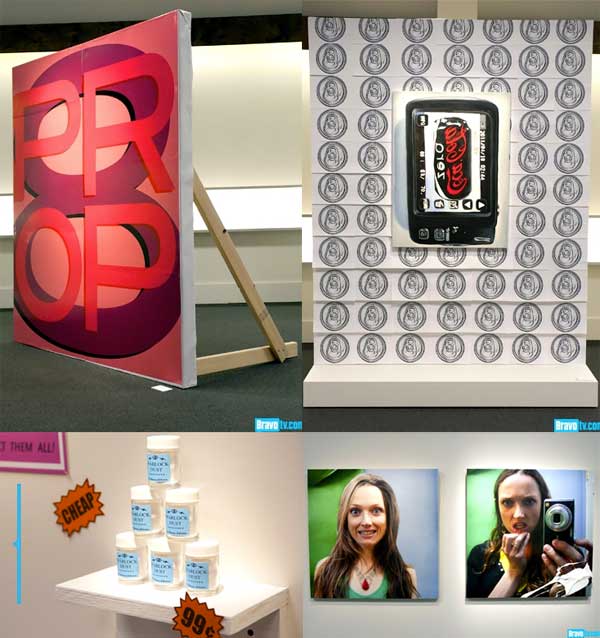 Gallery show! I hate pretty much every piece this week except for Lola’s, with its cute King Tut puns, Sucklord’s witty Charlie Sheen thing (which probably seemed a lot more relevant when the episode was actually filmed, pre-America’s OD on Tiger Blood), and Kymia’s slick advertisement-like photo (I did find it interesting that Bravo censored her photographing herself, and then felt no need to blur out her naked bewbs). I also enjoy Sara Jimenez’s reference to dating but actually one-night stand site OKCupid. Bayeté’s fused photo just looked like a vaguely ethnic white lady (he should work for Time!), and was my least favorite piece.