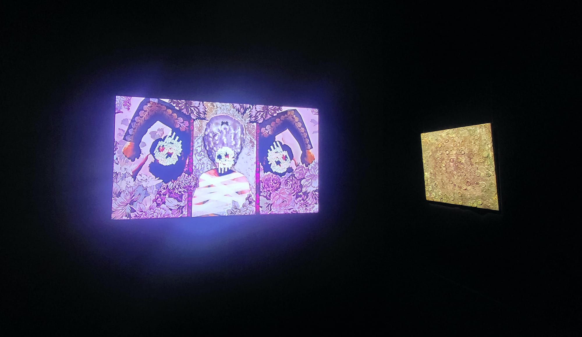 A sense of directness emanated from each work. In the foyer, on the right hand wall and over two columns, was Rahee Punyashloka’s "contextualising the protagonist," made up of bold black decal letters that proclaim Dalit marginalization. Look down and you'd notice Lara Chamas’s diptych, its parts titled "Pomegranate and Other Ammunition" and "tools that He made, for my mama to feed us" (both 2021), respectively, blurring the line between homely objects and wartime weapons. A black curtain led to another room; as visitors walked through the darkened space into surprising corners, Arts House’s main performance space was transformed into a maze of sorts. Sometimes the works literally spoke to each other, as when Shah’s piece click-clacked against the distorted sounds of Punyashloka’s affecting "Tannerfilm#1" (2023) upstairs. It was not necessarily harmonious, which was the point.