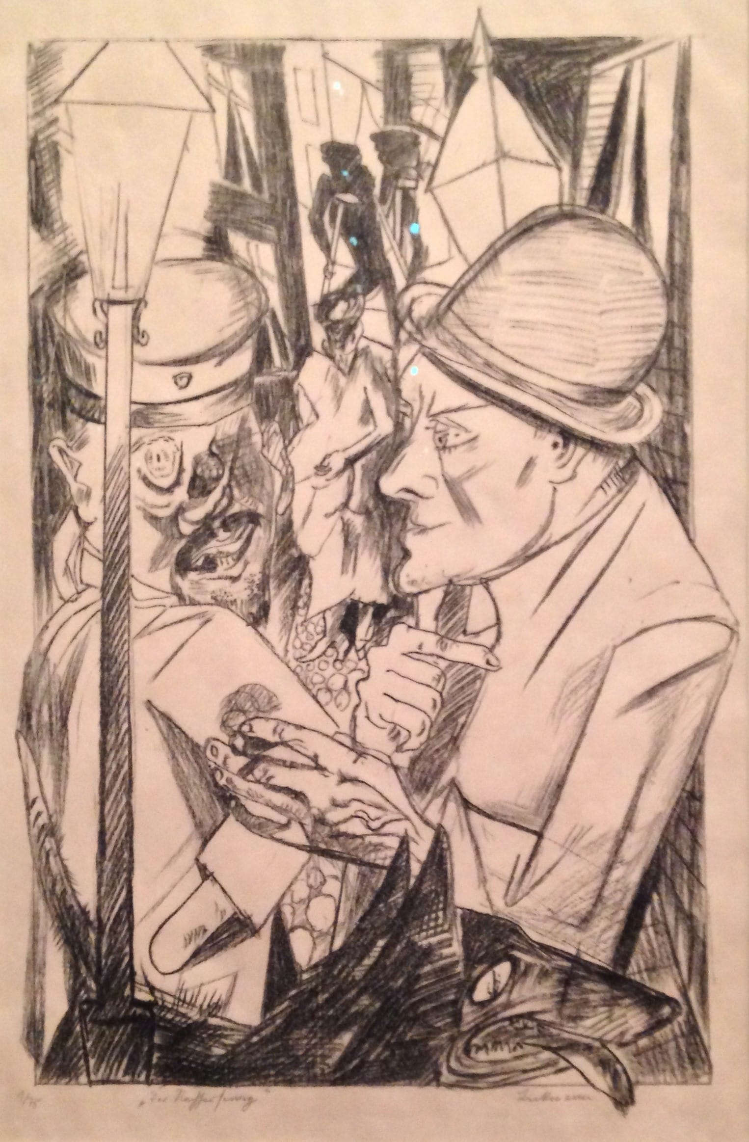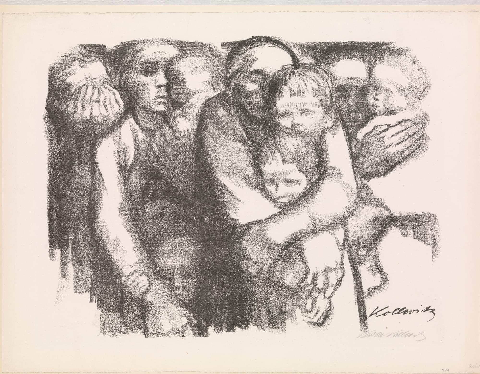 Kollwitz, who initially supported the war, denounced it after the death of her son, Peter. The Aftermath section features Kollwitz’s lithographs “The Mothers” (1919) and the mournful “Killed in Action” (1920), as well as works by Ernst Barlach, Max Beckmann, Erich Heckel, and Ernst Ludwig Kirchner, and complete print portfolios by Otto Dix and George Grosz.