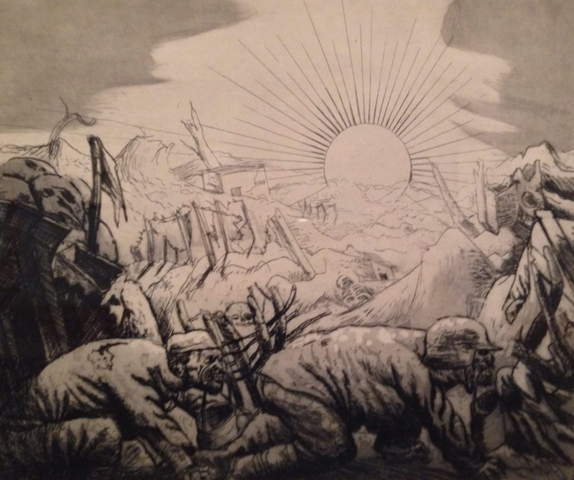 In many cases, the most effective works are the simplest. Belgian artist Léon Spilliaert’s poignant 1917 watercolor, gouache, and graphite painting “Rockets” transforms flares into a constellation of stars illuminating an indigo sky. Japanese-American artist Kerr Eby portrays an explosion with an expanse of negative space consuming almost the entire upper half of his drypoint print “A Kiss for the Kaiser” (1919). Eby’s mezzotint and drypoint print “No Man’s Land — St. Mihiel Drive” (1919) is more evocative, as its soft, deep gray washes over the sky, veiling troops below.