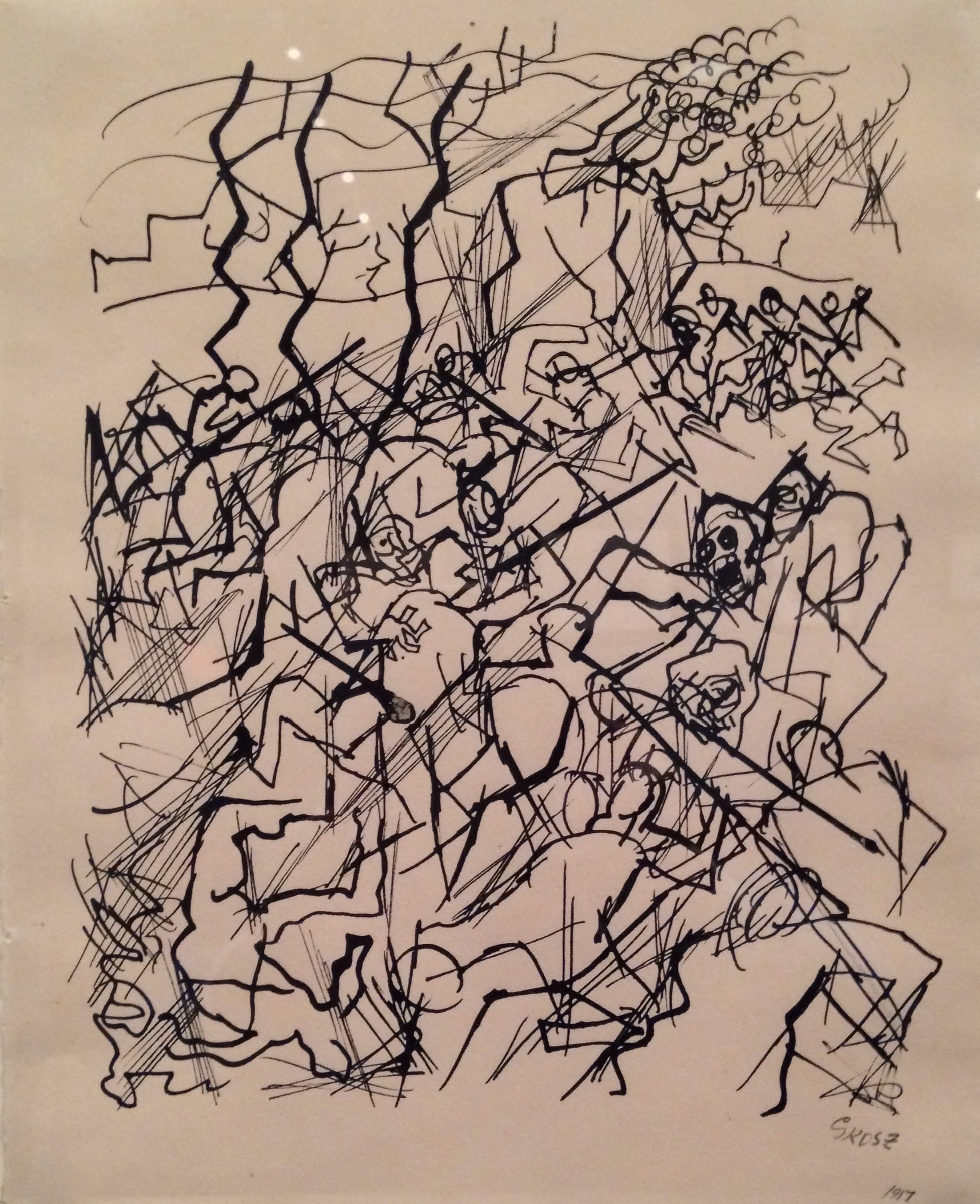 Accompanying Grosz’s prints is the 1917 ink-on-paper “War Drawing.” The composition is a tangle of jagged black lines, suggesting barbed wire and dead trees, overlaid with marching stick figures and plumes of smoke. A chilling face at the far right edge — mouth gaping in a cartoonish scream — reduces the chaos to a moment of deathly fear.