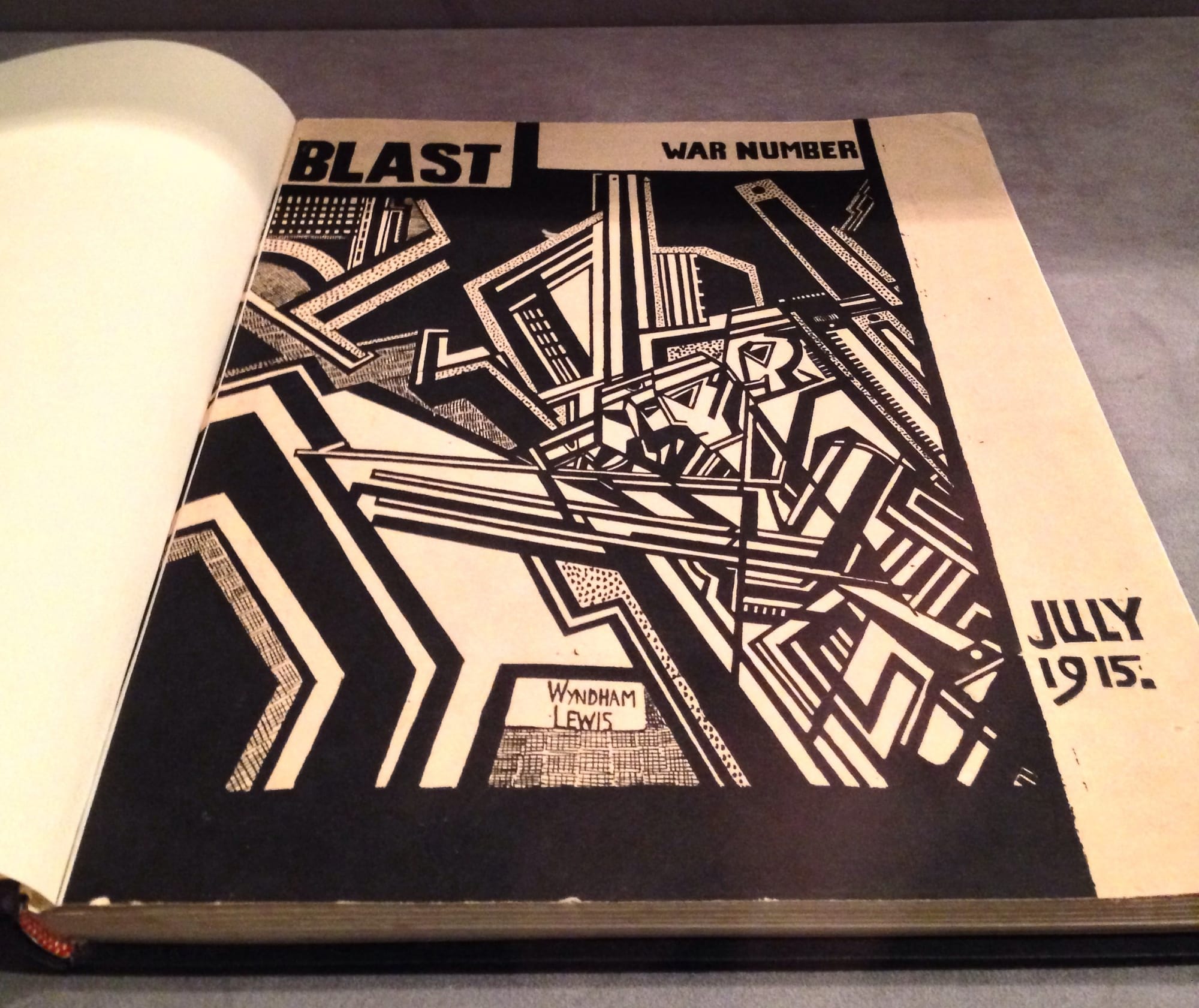 International modernisms are represented in works by artists including Gino Severini, Wyndham Lewis, Fernand Leger, Otto Dix, and Marsden Hartley. While pieces such as Lewis’s geometric machine gunners for the cover of the periodical Blast (July 1915) and Severini’s charcoal drawing “Flying Over Rheims” (1915) toe the Futurist/Vorticist line of technological dynamism, Severini’s “Still Life: Bottle + Vase + Journal + Table” (ca. 1914-15), which collages a charcoal and gouache abstraction with newspaper clippings on French military actions, brings a level of social commentary to the image.