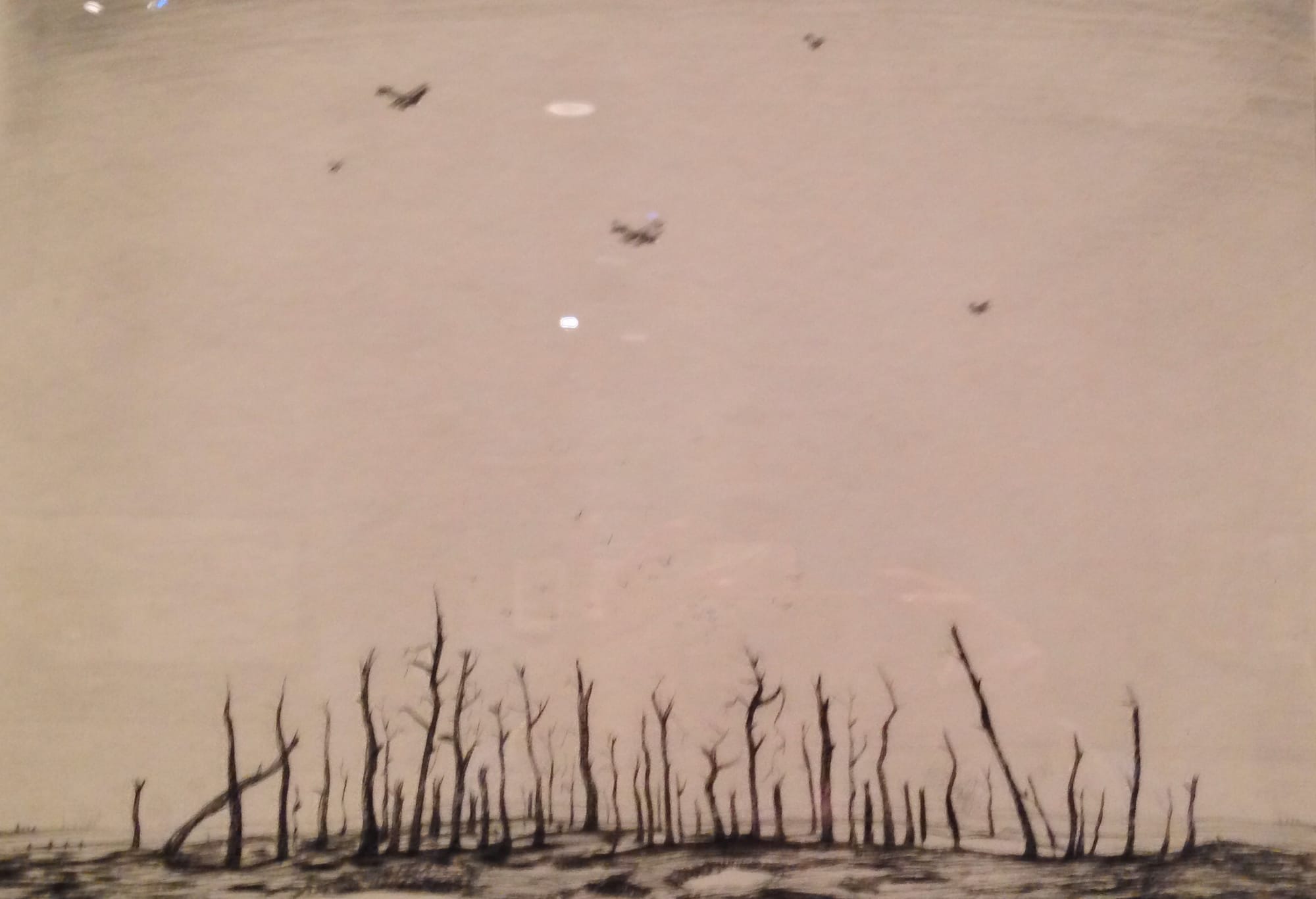 British artist Christopher R.W. Nevinson is particularly well represented. An early acquaintance of F. T. Marinetti and Wyndham Lewis, he diverges from Futurist and Vorticist influences in his print, “That Cursed Wood” (1917), a bleak image of dead trees emerging from the pockmarked ground, as biplanes circle overhead like ravens in the gray sky. Another impression of the ruined earth, Edward Steichen’s photograph “Aerial View of Vaux, France, After the Bombing Attack” (1918) shows the city as so much rubble. Cropping out the sky entirely, Steichen refuses the viewer a way out of the destruction.