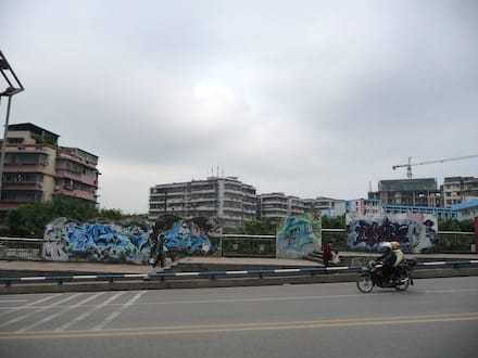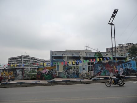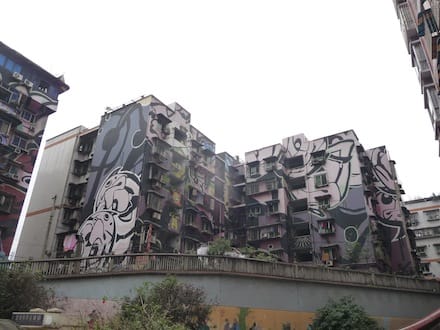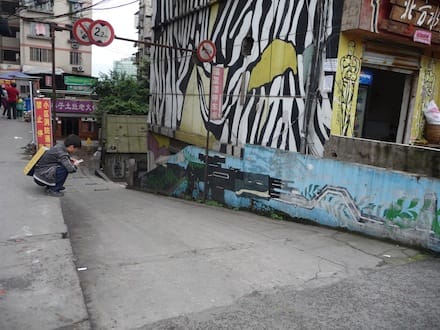 In this land of superlatives, Chongqing’s graffiti street stands out, the work of hundreds of students from the Sichuan Fine Arts Institute, one of the country’s more prestigious art universities. The work covers some 40,000 square meters of wall along 1.25 kilometers of Huangjueping Street (黄桷坪), affectionately known as Graffiti Street (涂鸦路) by locals.