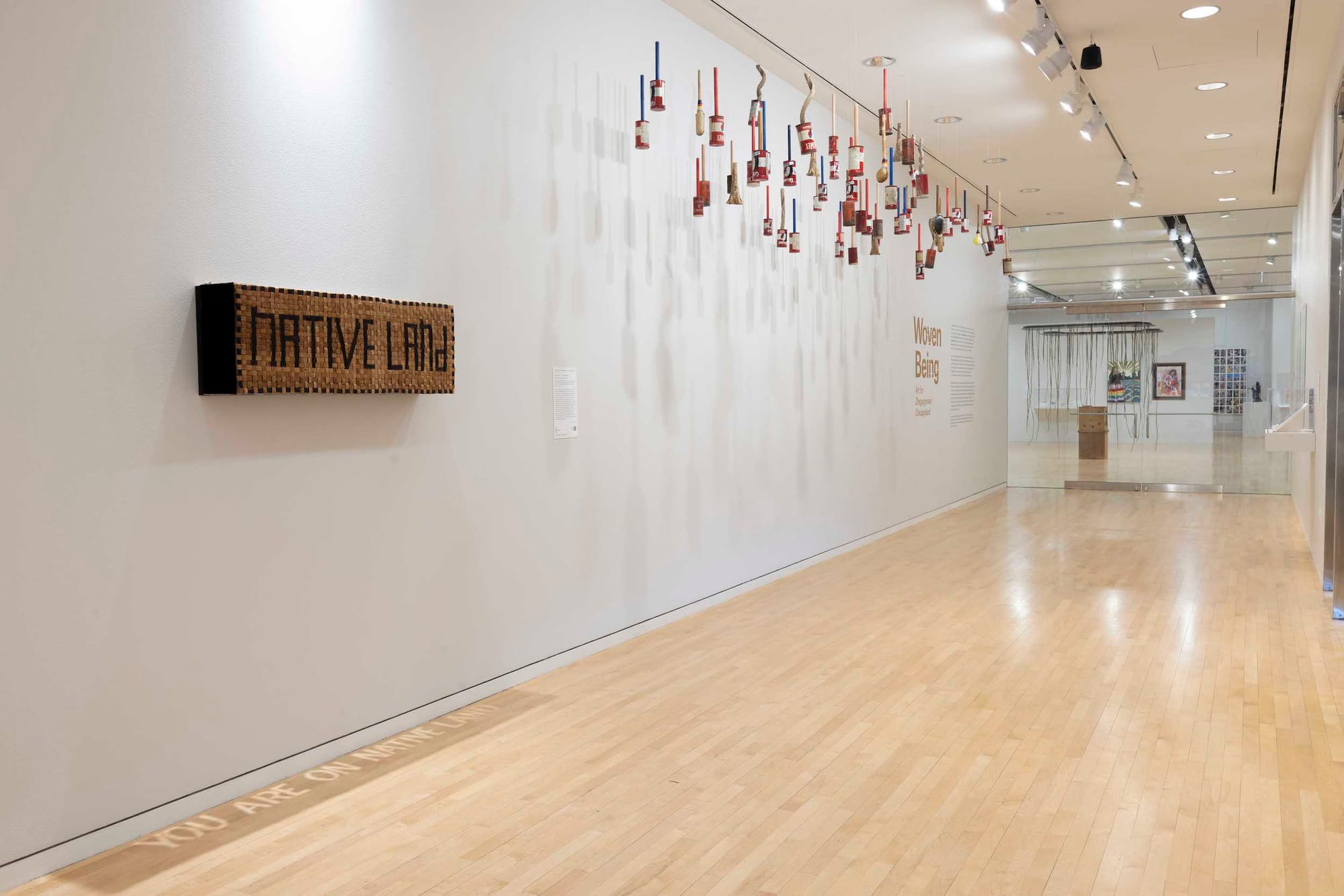 Naturally, given its title, Woven Being includes a whole lot of baskets, as well as non-baskets made using related weaving techniques and materials. A few of these are traditional, but most are not, proving both the versatility of ancestral methods and their critical potential. Kelly Church plaits black ash and white cedar bark to form a boxy sign that spells out “NATIVE LAND” in dark lettering; a second phrase, “YOU ARE ON NATIVE LAND,” is cast on the ground below by light shining through the sculpture. She twists a porcupine basket from shiny white vinyl window blinds, not for the sake of novelty but because the emerald ash borer, among other threats, has devastated basket-makers’ trees. Cherish Parrish, Church’s daughter, turns a basket into a freestanding jingle dress, and Lisa Telford creates an equally witty ode to the feminine with a pair of high heels twined entirely from red and yellow cedar bark.