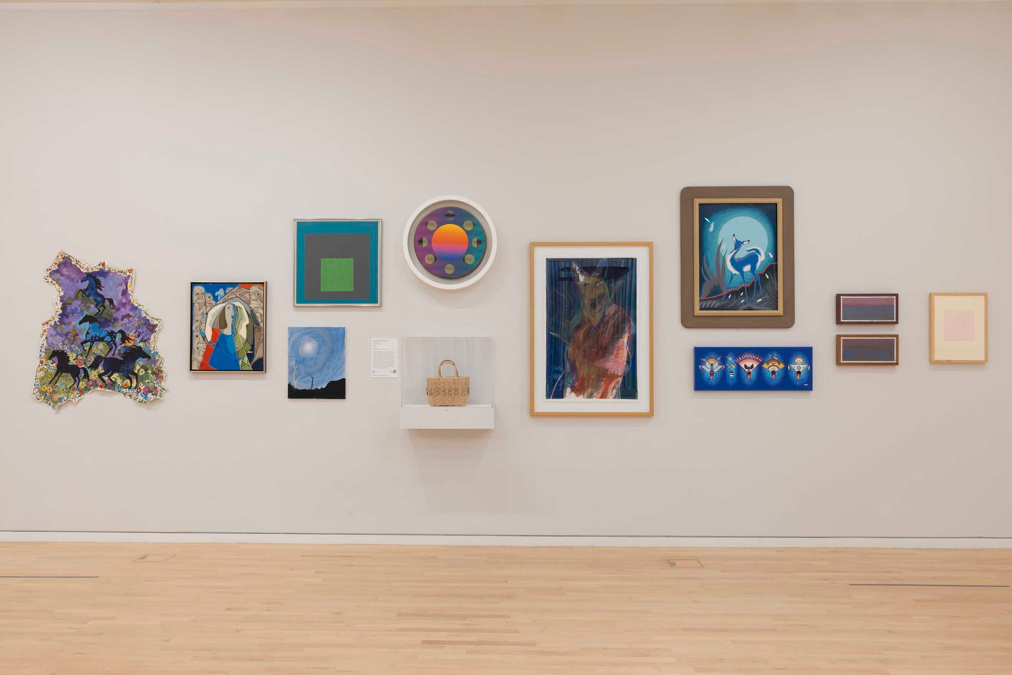 Any show with multiple curators, especially artist-curators, is going to have sub-themes, declared and not. Woven Being is no exception, and Jason Wesaw’s great contribution is a conversation about Native versus non-Native abstraction, prompted by his inclusion of little modernist gems from Josef Albers, Barnett Newman, and Agnes Martin alongside Indigenous counterparts. Jeffrey Gibson’s elk hide drum dazzles with disco sun and moon vibes, while George Morrison’s pointillist studies of Lake Superior luminesce. They are all in good company in terms of both art history and installation — their salon-style hanging is a highlight of the show. Meant to pay respect and bring overdue attention to some of the elders who have played a critical role in the Indian art community in Chicago and beyond, the selection also features some mighty fine artworks. It includes an improbably blue deer by Woodrow Wilson Crumbo, a cubistically rendered lodge by Daphne Odjig, an elegantly expressionist wolf-man by Rick Bartow, and newfangled warrior symbols by Joe Yazzie that would look equally good on skateboard decks.
