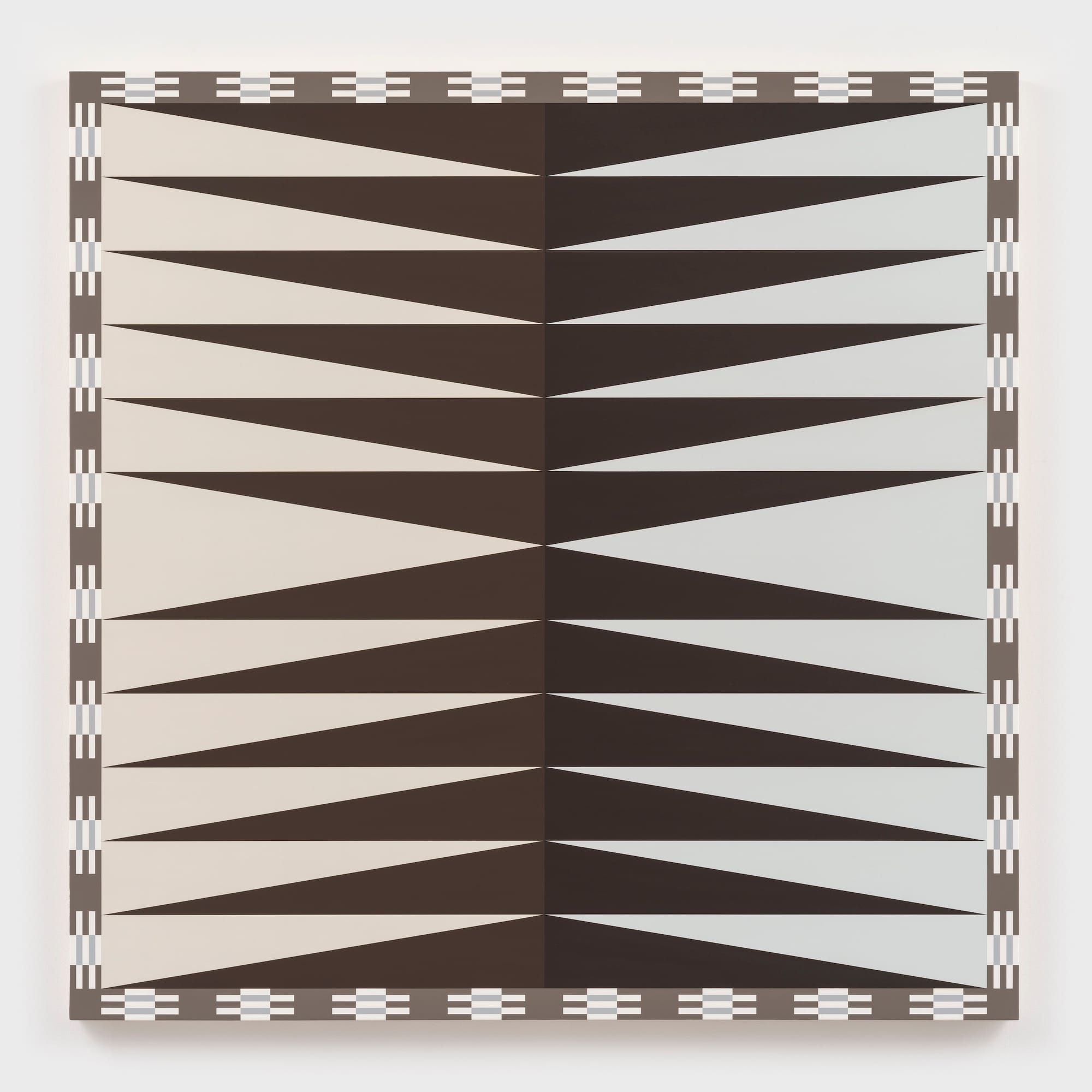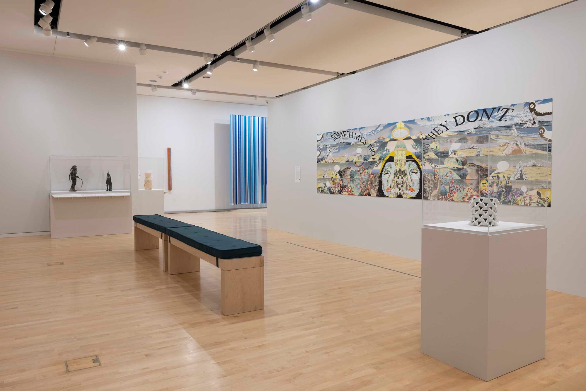 Woven Being is accompanied by a small, conventionally organized, and absolutely wonderful solo show, held in the Block’s downstairs gallery, dedicated to the Northern Cheyenne painter Jordan Ann Craig. it takes a long time to stay here showcases Craig’s crisp geometric compositions, their rigidity softened by Southwestern colors and unfinished sides, their poetry amplified by specific but unknowable titles. Head on, they are still; from the side, they vibrate. Indebted as much to Neo-Geo and Op-Art as to traditional Indigenous textiles and quillwork, Craig participates in the discussion about abstraction ongoing upstairs. And she adds to it: Unafraid to acknowledge the ornamental aspects of patterning, she decorated the gallery’s padded bench covers, so visitors can stay here a while.
