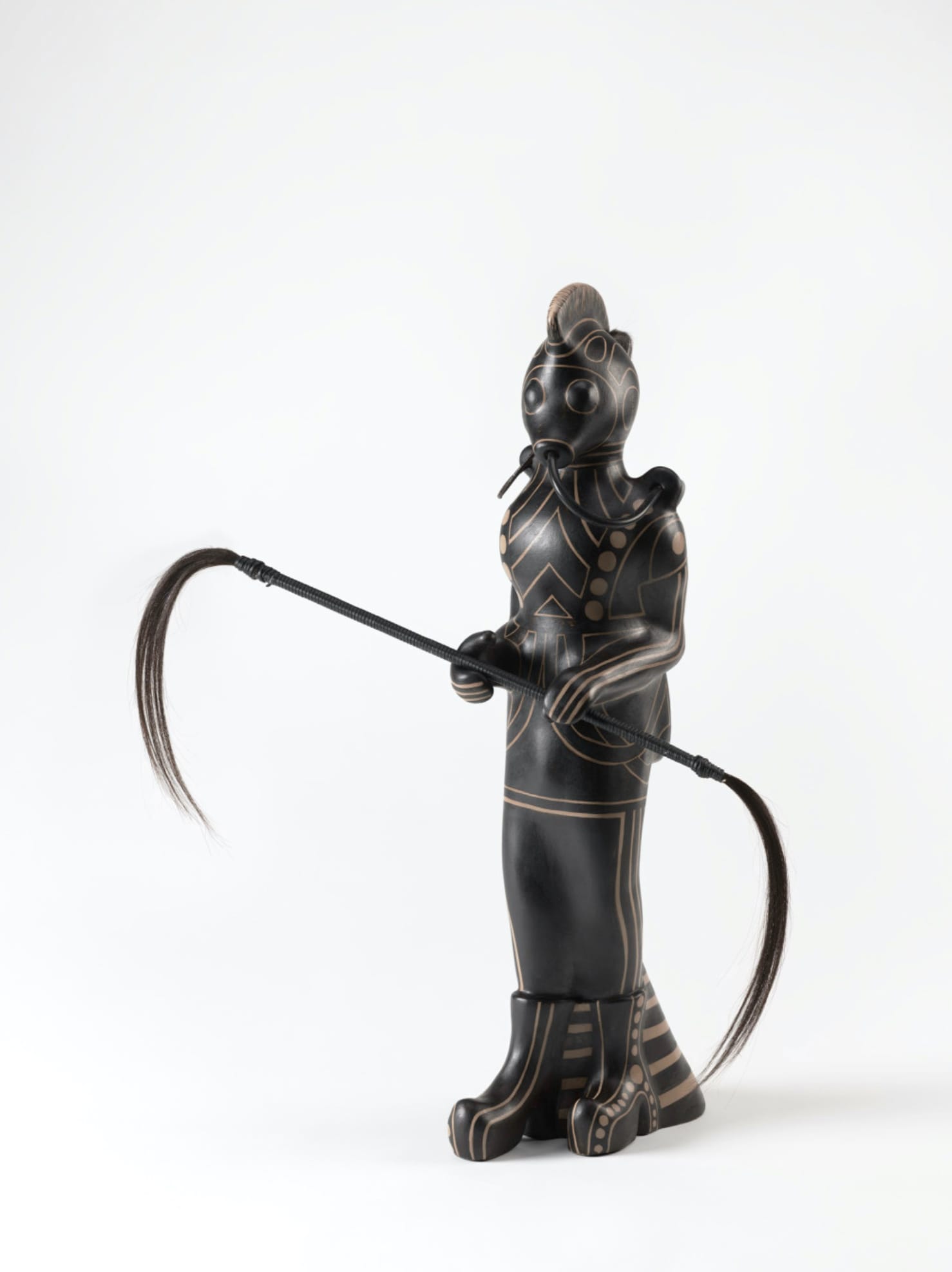 Though only a few artworks touch on specific historical persons and events, the smell of sweetgrass infuses the entire exhibition, emanating from Kelly Church’s memorial to the generations of Native children forcibly removed from their homes and sent to Indian Boarding Schools. Two clay figurines by Virgil Ortiz invoke the Pueblo Revolt of 1680, when the nations of New Mexico banded together to push out their Spanish colonizers and kept them out for 12 years; slickly outfitted in gothic sci-fi gear decorated in Pueblo pottery motifs, Ortiz’s “trackers” are as much about the future as the past. Chris Pappan, a candidate for finest living draftsman in Chicago, presents a haunting triptych based on 19th-century photographs. Meticulously rendered in graphite, a member of the Sac and Fox Nation is mirrored, fragmented, and gridded, then run through with brilliant blue gouache in the “Y” shape of the Chicago River — as if de-oxygenated and violently plotted, like this land.