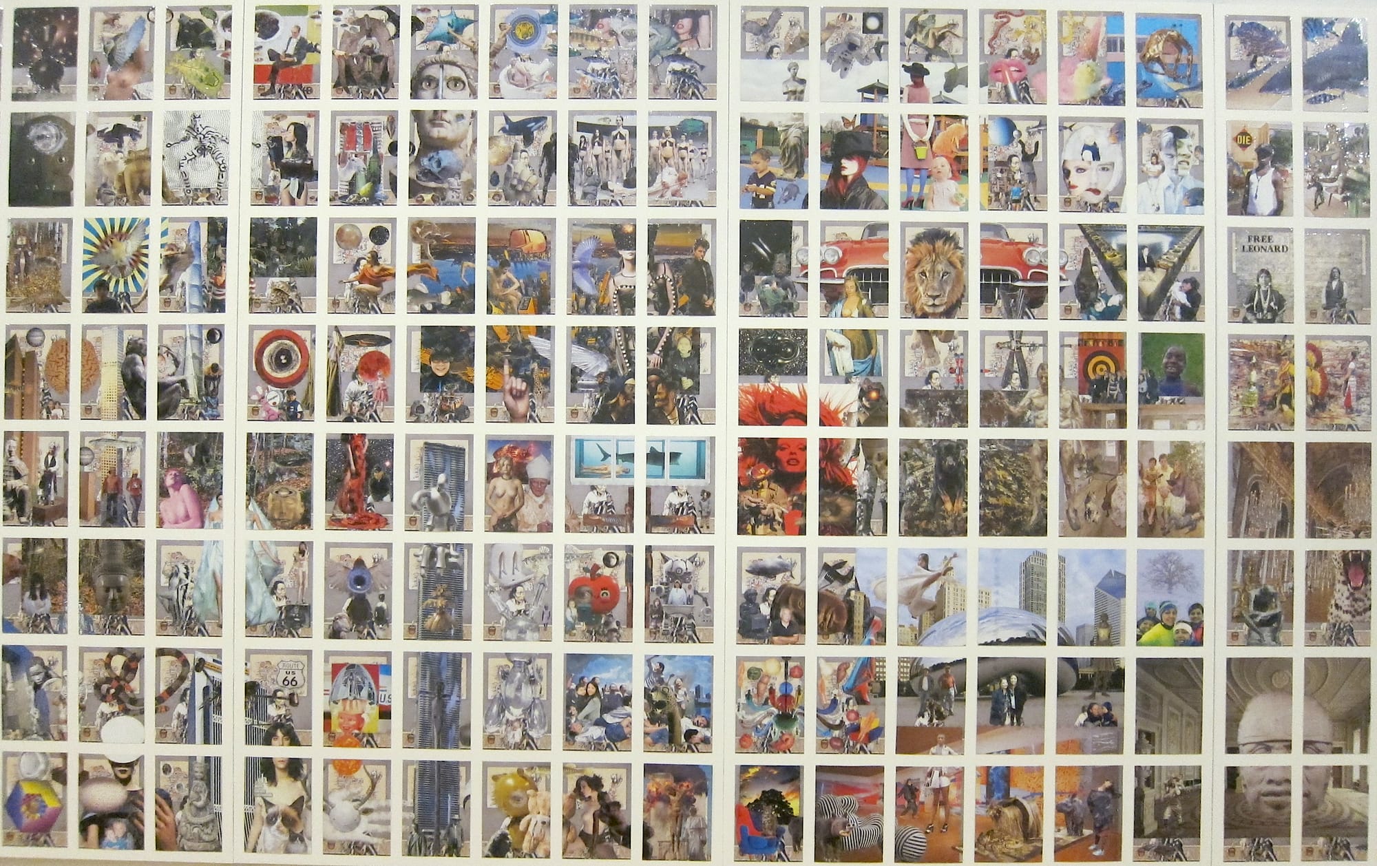 EVANSTON, ILLINOIS — The single greatest collage I have ever seen is by Frank Big Bear, a member of the White Earth Ojibwe tribe. “The Walker Collage, Multiverse #10” stretches more than 30 feet wide and includes cut-out images of everything. I mean everything: Cycladic figurines and Cindy Sherman dress-up, Assyrian kings and Marilyn Monroe, the human brain and a poison dart frog and high fashion and war death and family and friends and a Studio Gang high-rise and the cosmos. And that’s only about two dozen of the individual panels that comprise the tidy wall-length grid Big Bear completed in 2016. Any one of those is a good collage on its own, but there are 432 of them, each made on an identical invitation card for an exhibit by Star Wallowing Bull, the artist’s son. Most interconnect, mesmerizingly and surrealistically, and the sum total is utterly flabbergasting.