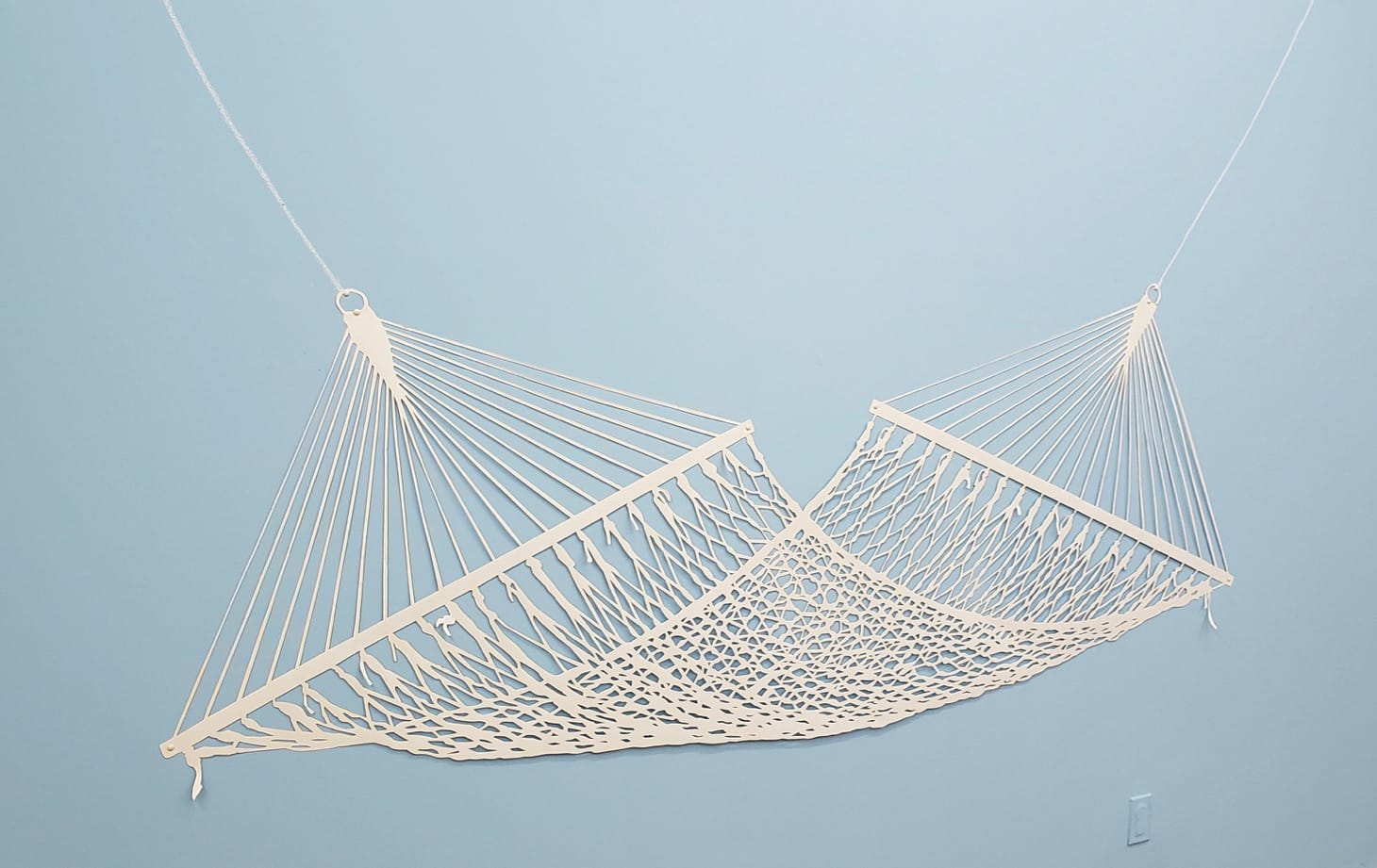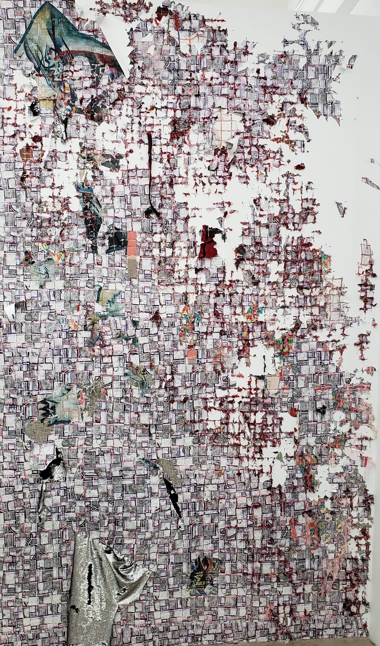 The plunge is far more shallow in the hammock that Carly Glovinski has devised out of laser cut watercolor paper for “Day Off” (2018). What’s lovely about the piece is the way it is earnestly casual. The lines that should connect the hammock to its supports are drawn with chalk and connected to it by way of white-headed thumbtacks embedded in the wall; the thumbtacks actually do the work of keeping the sling aloft while the chalk lines tell me that the thing really exists only in fantasy. Lastly, there is Elana Herzog‘s “Untitled” (2019) which mixes metal staples, fabric fragments, her own wallpaper, and a drywall substructure. It’s all tattered and torn like the wall itself is slowly inching toward oblivion. But the wall remembers the beautiful things that once adorned it while it slides into entropy.