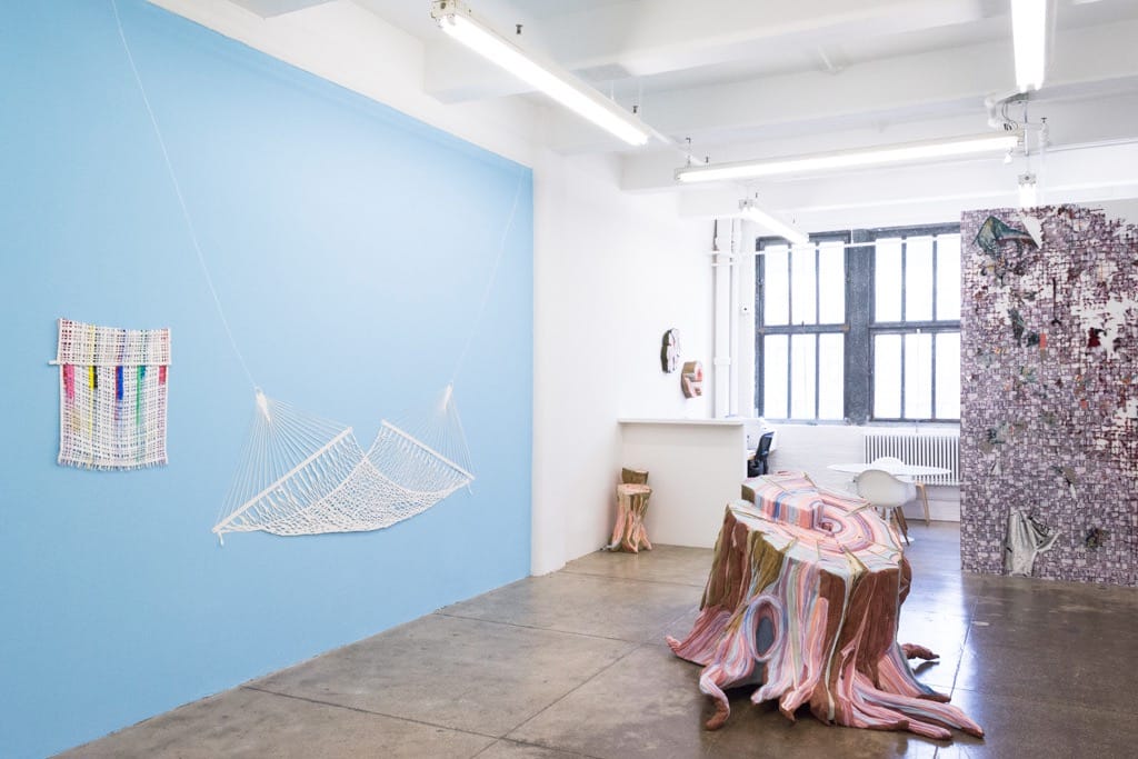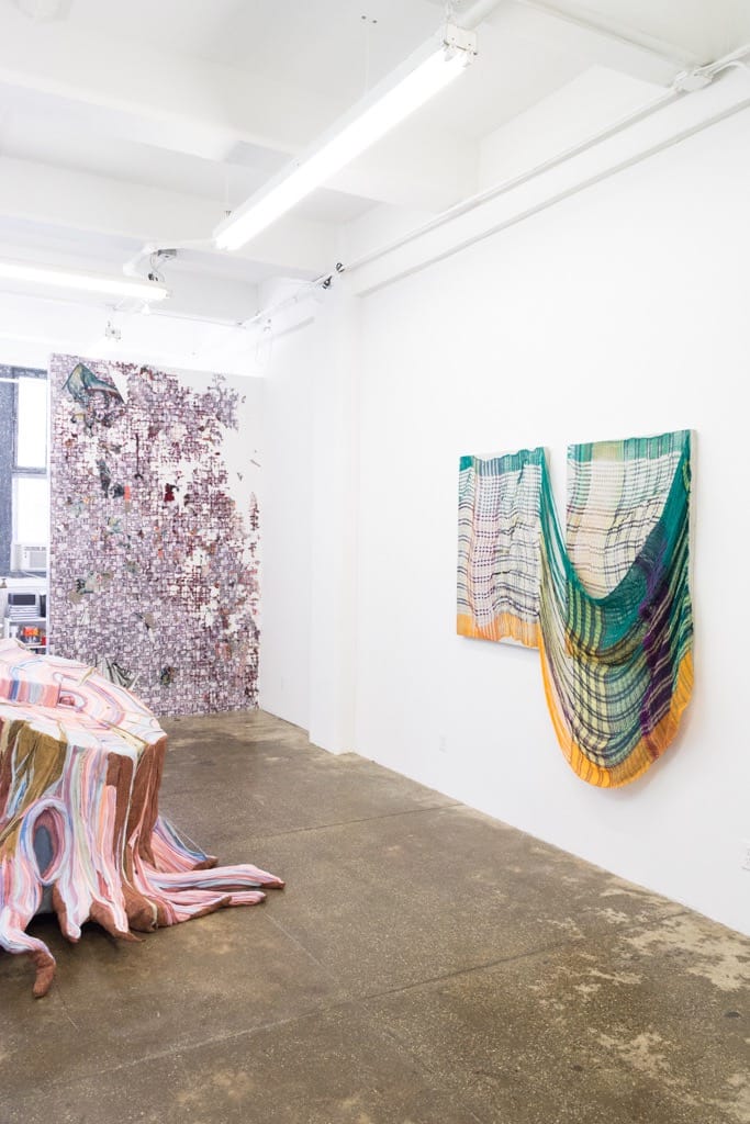 Sometimes I walk into an exhibition and language starts to sing in my head, when it’s so tightly curated that I go pinging from one piece to the next, each one raising the ante for the collective pot of surprise. I had this experience with the Woven Walls exhibition at Morgan Lehman Gallery. Many summer shows consist of a selection of disparate room-temperature art brought together because the artists have some relationship with the gallery, but here this show is cohesive, generally connected through the use of textiles, though textiles aren’t the only material in use.