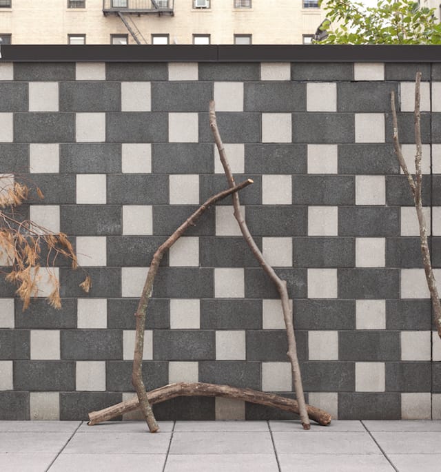 The first thing that strikes you about the exhibit is just how little it strikes you. The terrace walls against which the branches lean are patterned in bold, gray-and-white checks that, as you ascend the stairs to access the terrace, make the branches appear as slight, barely visible wisps of gray line. If you didn’t know they were there you could easily miss them. Far from rendering the work aesthetically ineffectual, this inadvertent architectural camouflage actually enhances the show’s alien, archaic mood.