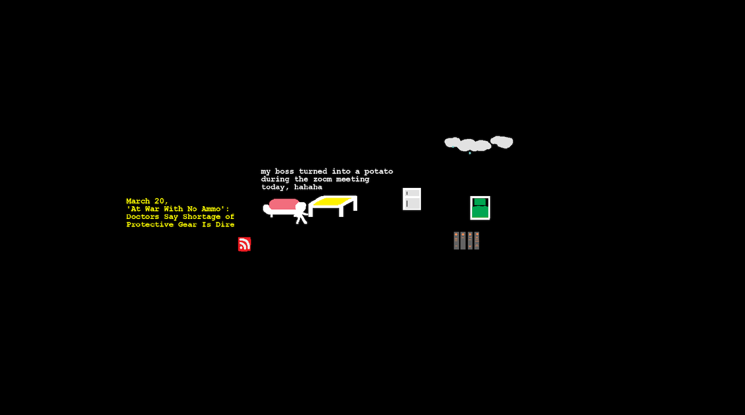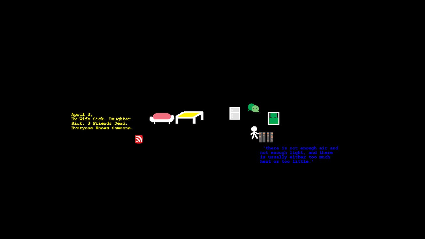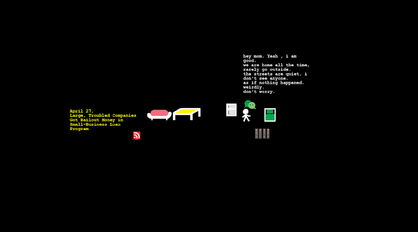 The game, which at times feels more like video art, begins innocuously, with an unnamed stick figure in a cramped studio-style apartment — based on Liu’s Brooklyn brownstone — fitted with a bed, a couch, and a bookshelf. You, as the stick figure, can move using the arrow keys on your computer, but you cannot leave the flat. As you walk around, different color-coded texts are activated: white indicates internal thoughts; blue for quoted literature (these pop up only when you walk near the bookcase); and yellow for news headlines on COVID-19, which you can’t turn off once activated, mirroring real-life doom scrolling.