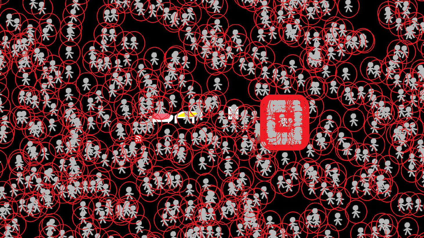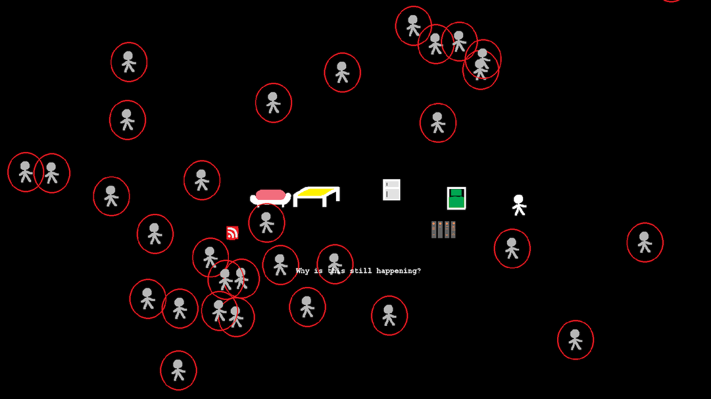 Taken from E.B. White’s 1949 essay “Here is New York,” the text is damning in its criticism of an unequal, chaotic sociopolitical system, and points to the game character’s own anxieties around a city incapacitated in a crisis. As our stick figure dreams, a gray stick figure, encircled in a red lesion-like halo, appears and drifts listlessly around the screen like the ghost of a COVID-19 victim. Another appears; then another, clustering near our character. The replication happens slowly, but the effect is still overwhelming — soon, our stick figure is engulfed and can no longer move. When the screen fills up, all the figures also stop moving, as if embodying the numbed sense of loss and helplessness around the thousands of COVID-19 deaths.