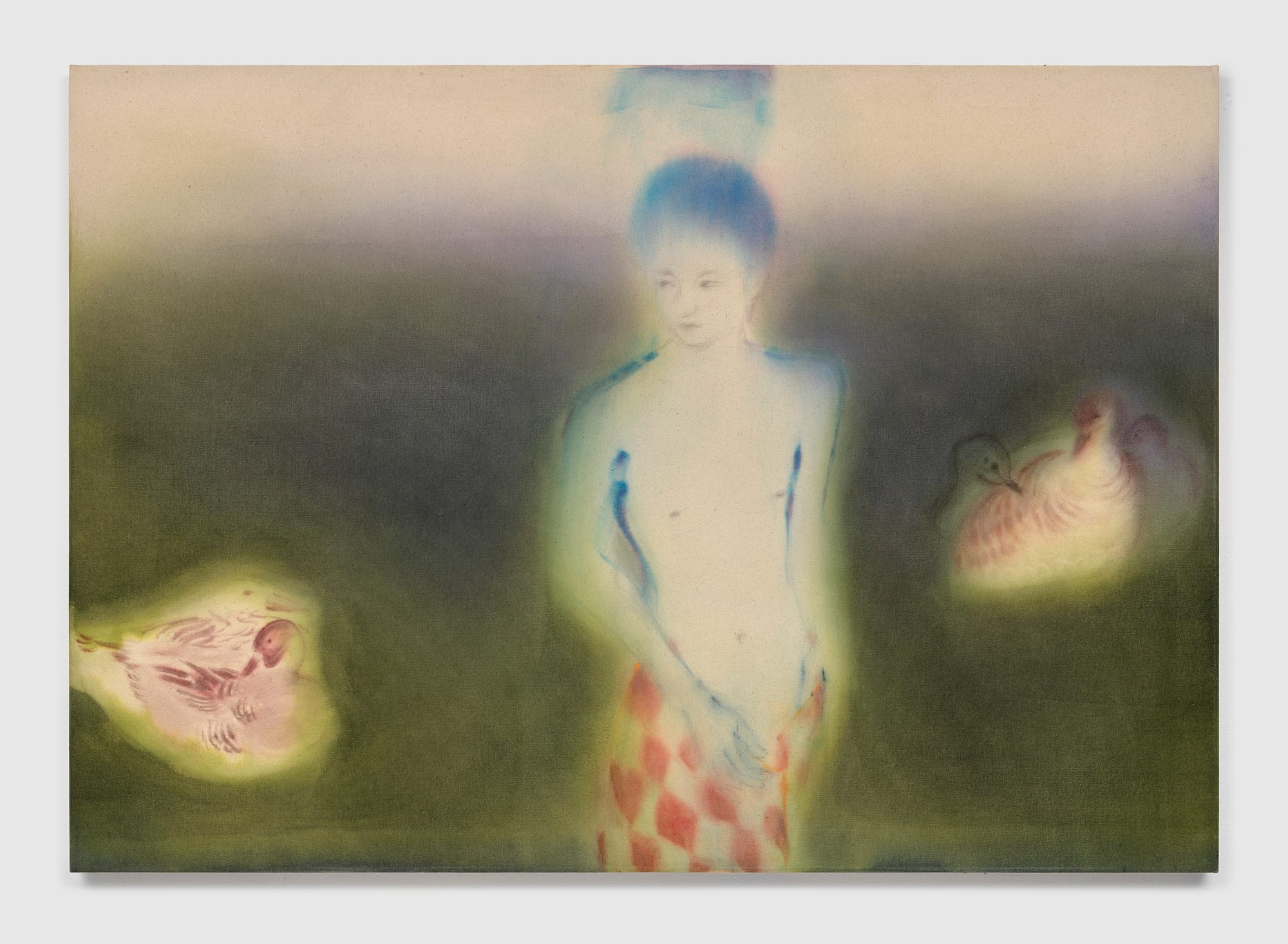 In “Lili Pond” (2023–24), a blue-haired, bare-chested adolescent boy in checkered pants or a towel poses against a vaporous green ground with a horizon line near the top of the canvas. Is he in a landscape or a dream? Ducks seem to float on either side of him. Ducks mate for life, and are a symbol of love and fidelity in China. Will the boy find a lifelong partner? Is that what he wants? While this may have been a goal of earlier generations, it is less so now.