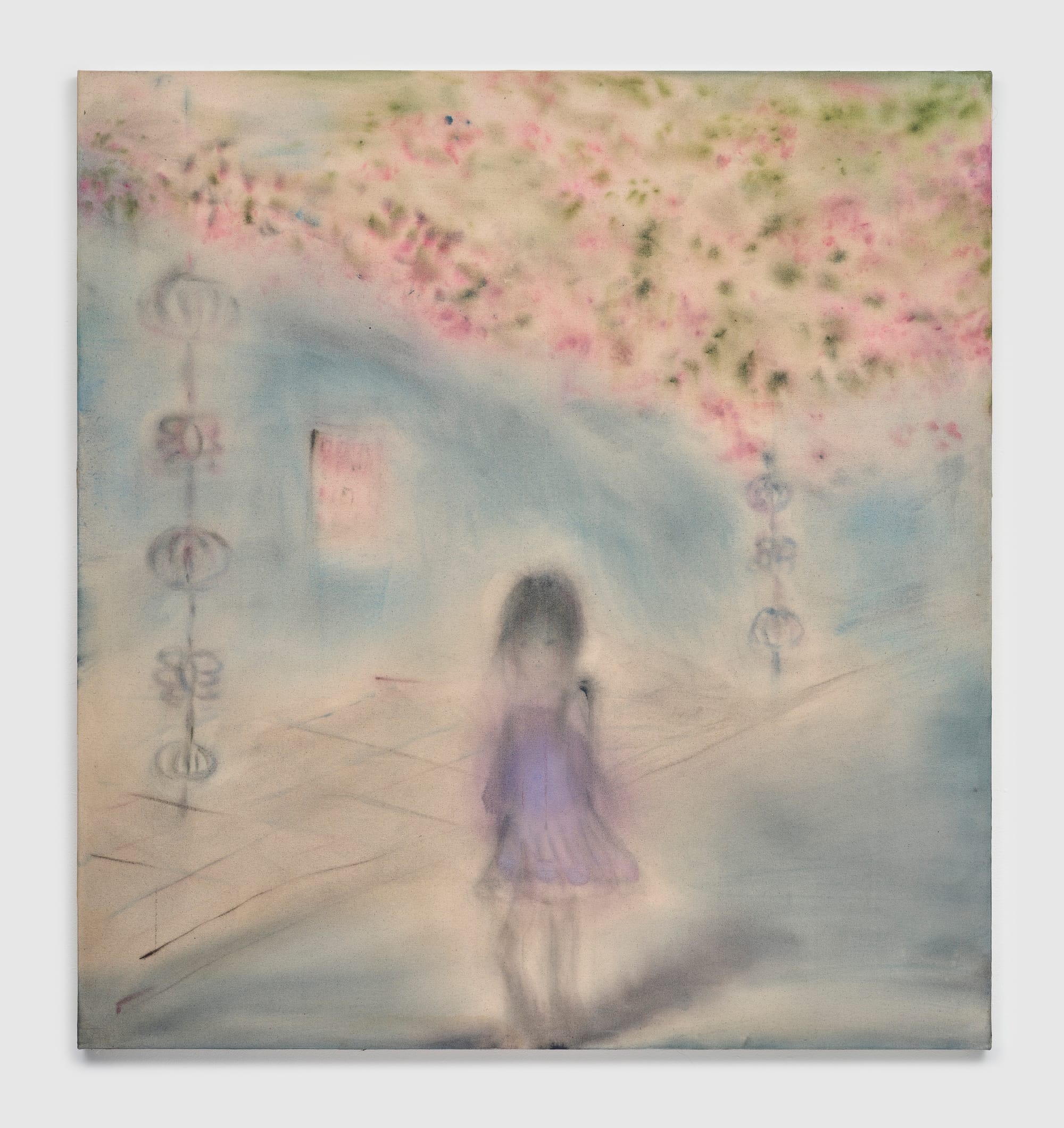 In “Sunny, mild afternoon” (2023–24), Gu depicts a young girl wearing a faded violet dress and carrying a backpack. She is centered in the painting, her feet touching the bottom edge. She seems to be walking on the street, the flowering branches of a cherry blossom tree forming a roof over her head. The juxtaposition of the young school girl and cherry blossoms forms the heart of the painting. In traditional Chinese culture, cherry blossoms are associated with femininity — and the yearning for love. What does the future hold for the girl? What possibilities await a young woman growing up in the gerontocracy of China, or for that matter in the increasingly intolerant United States, where Florida has passed a law banning Chinese citizens without green cards from buying property in the state?