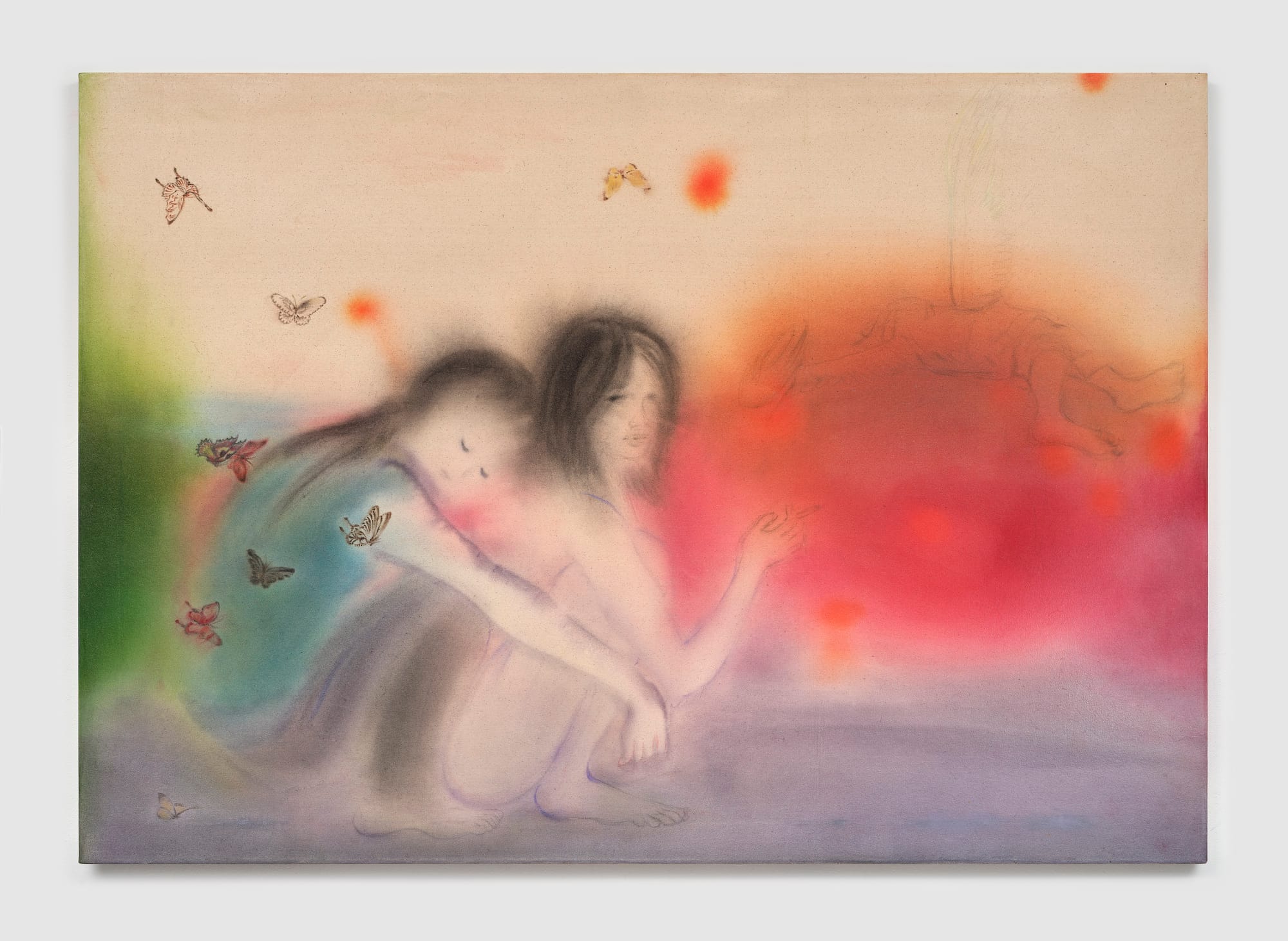 Combining online imagery and film stills, Gu layers, airbrushes, and stains acrylic and oil paint into vaporous scenes containing characters both boundless and bonded, undulating in and out of each other. Couples, cuddling ducks, and scattered butterflies occupy steamy, mystical realms that seem to dissolve into the canvas. In “Orange Bedroom” (2023–24), two shoulder-to-shoulder figures inhale cigarettes in victorious unison. Crimsoned from the waist down, with exposed chests, the characters are distant, paused in thought. Yet Gu imbues the scene with intimacy by depicting their shared comfort in the nude against the fiery red backdrop. Wispy shades of gray outline a veranda and a small fern in the foreground, with what looks like a tall bookshelf positioned behind, combining both interior and exterior features in the painting’s “behind-closed-doors” settings. A faded, dingy chandelier emits a moody hue in blotches of lighter yellows and reds, while a particularly shady section eliminates the figures’ flaws like the dim lighting of a bar.