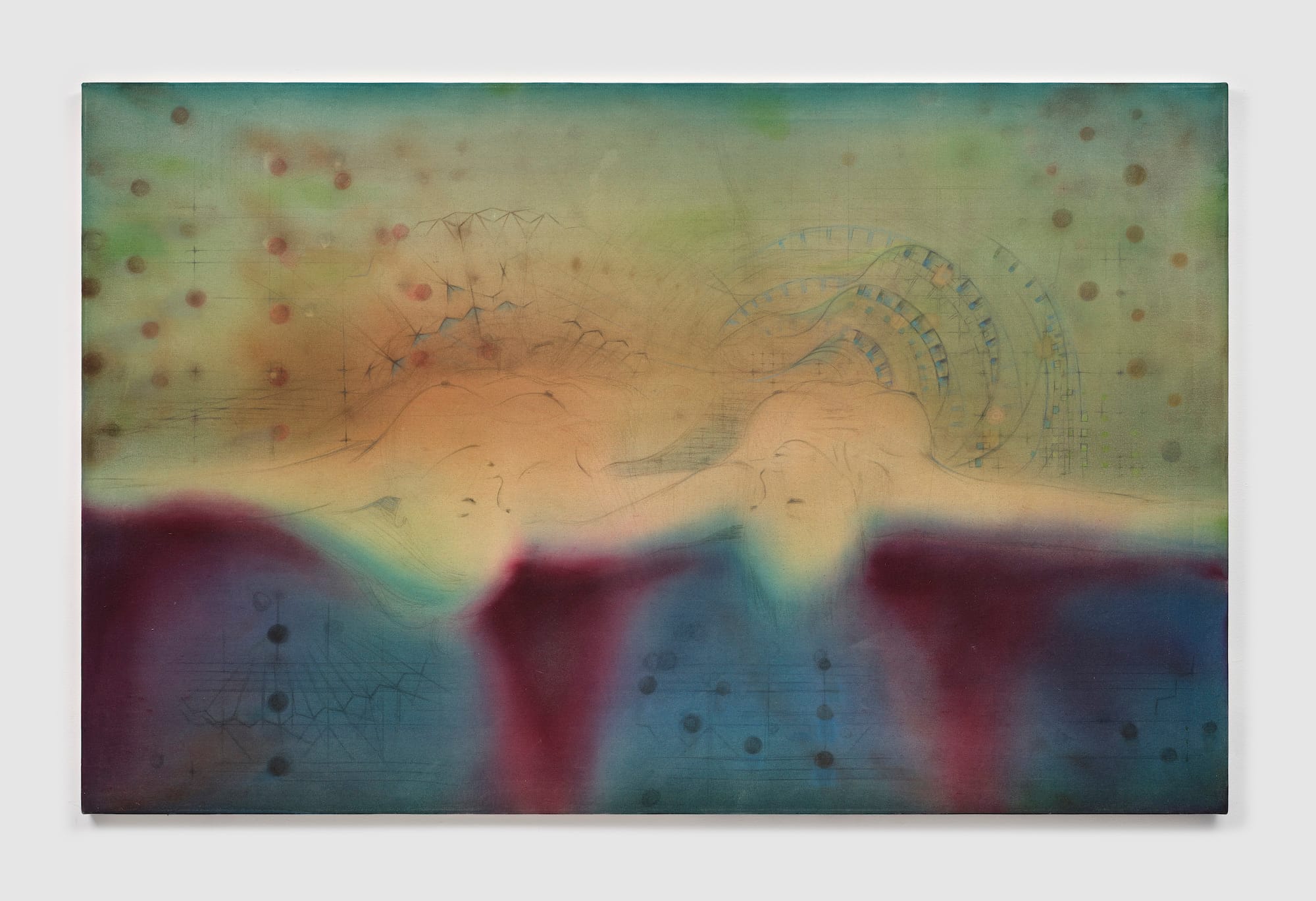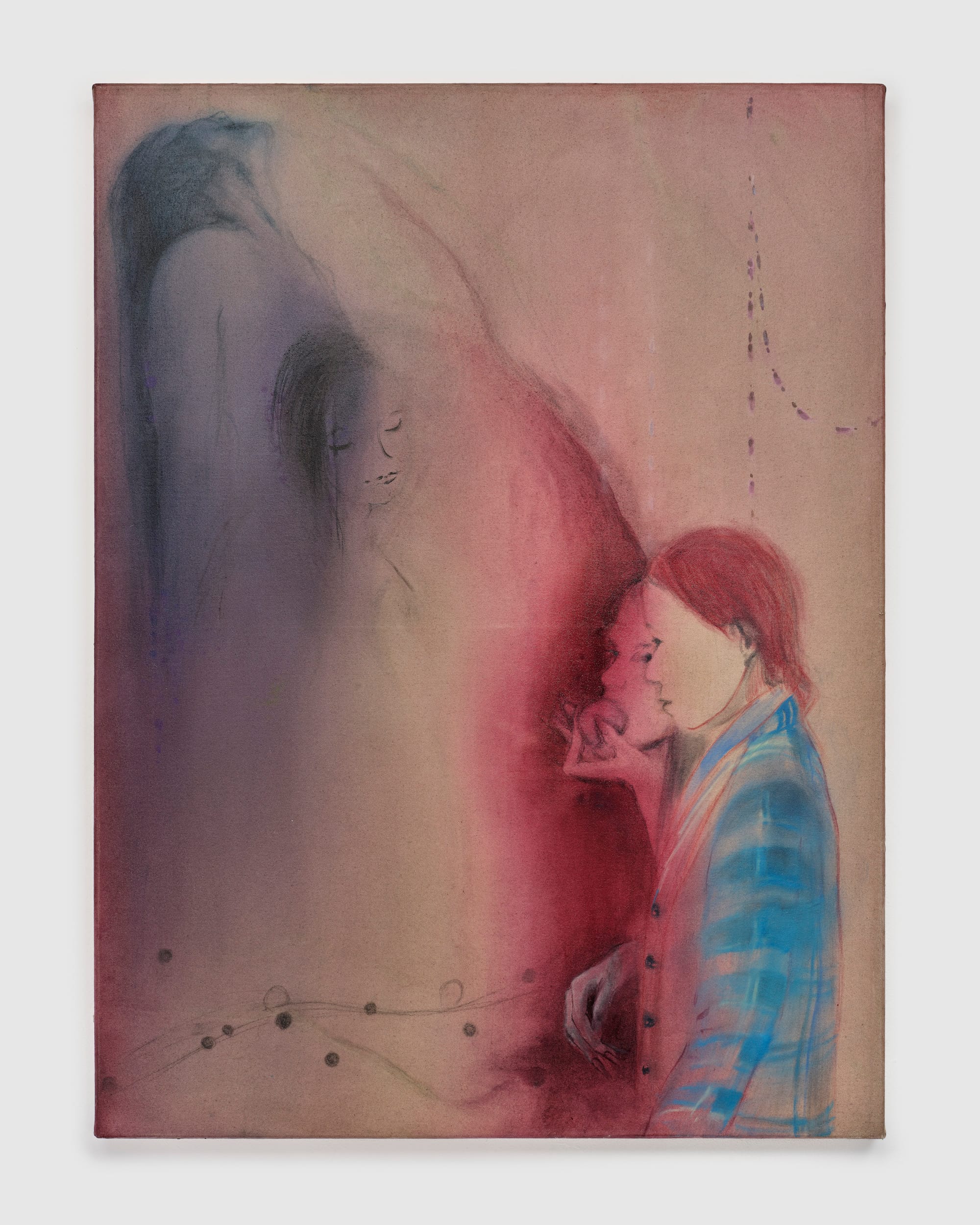 In “Untitled (Cherry Coke or Ocean Flame)” (2024), we are voyeurs to a tender moment between two androgynous figures who drape over each other, head to stomach, locked in a seductive gaze. Faintly dappled blue bubbles blow across their lounging embrace — from which I would never want to unravel — suggesting pheromone-infused goosebumps of ecstasy. It is said that those who emit a light blue aura are associated with qualities such as serenity, sincerity, and clear communication, framing Gu’s compassionate characters in relaxed yet engaging dialogue. Bubbly orb shapes continue in more fractal formations in “Landline” (2023–24), the exhibition’s most psychedelic work. Two figures, reminiscent of ballerinas with subtle traces of tutus, lie supine with splayed breasts. Muddy blues and vibrant aubergine shades halo their heads, referencing their “crown chakra,” which relates to connection, dreams, and higher consciousness.