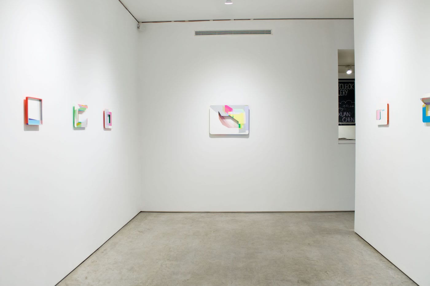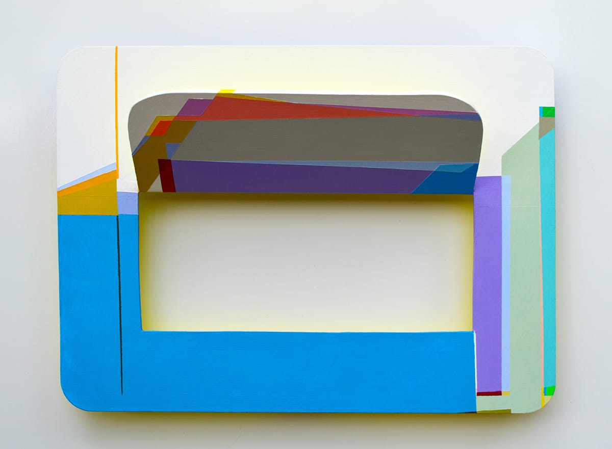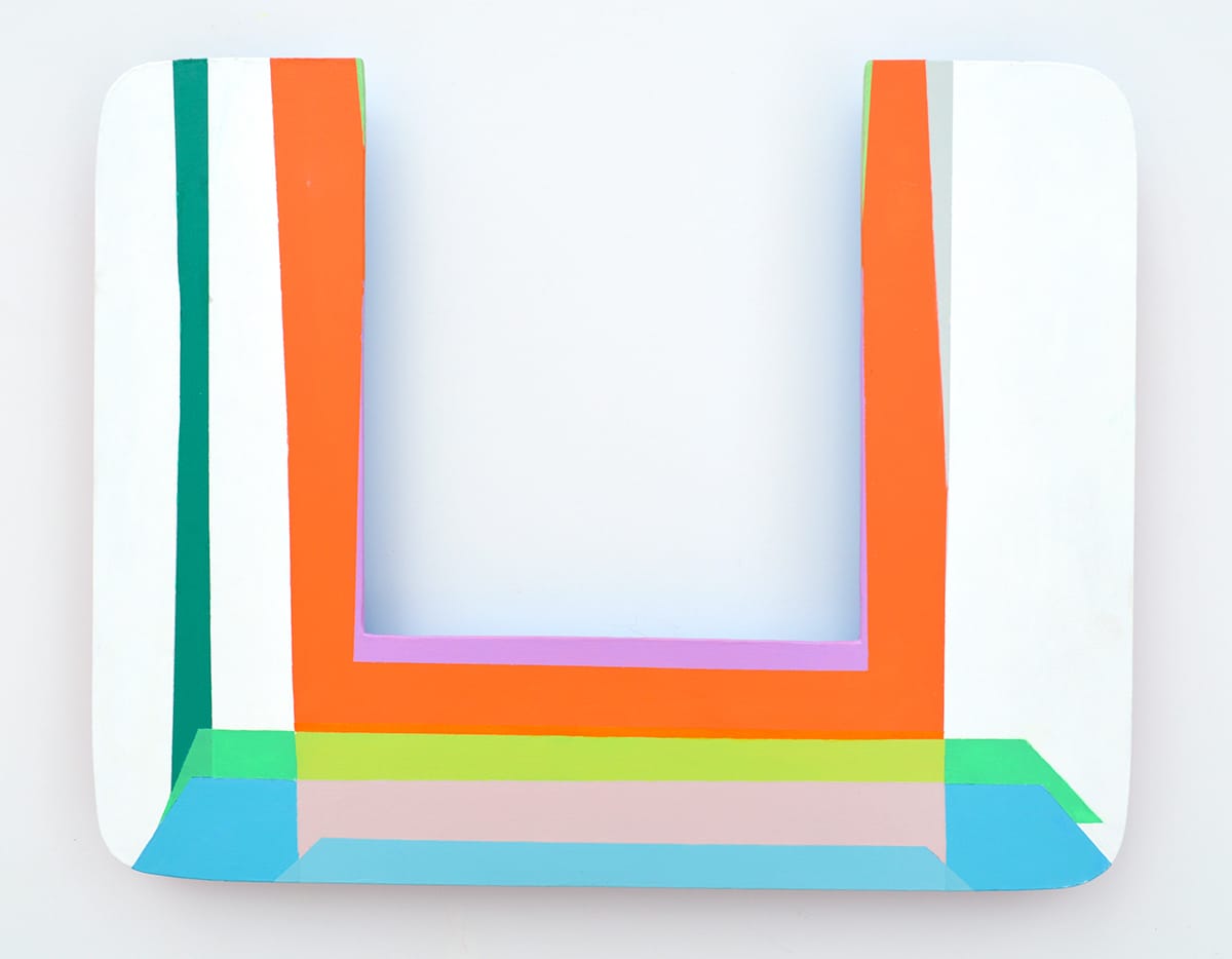 Chen paints on all sides of her objects, including the backs. Her vocabulary is geometric — planes and bands of solid color. At one point, I was reminded of the colored Plexiglas sheets you buy on Canal Street, because her angled planes seemed semi-transparent, as if light were passing through — an interesting illusion. Depending on the color and saturation, Chen can project a faint glow of color on the part of the wall that is visible through the cutout. Because a strip of shadow on the left is dark charcoal, while the one on the right side is pale gray, I began to wonder whether she had painted the shadow, even though I was sure she had not.