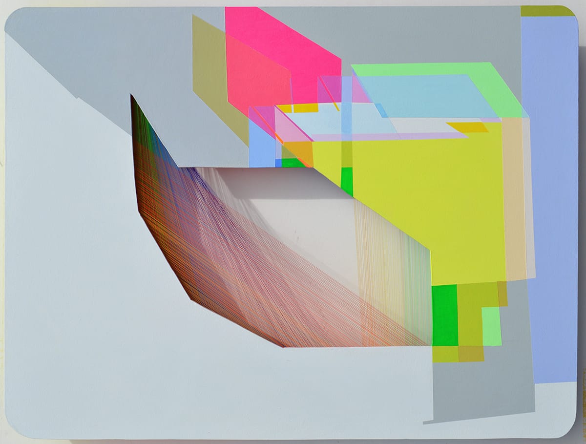 […] iPad-sized wall-sculptures [which] devise an intimate connection between the physical light, space, color and the viewer. Using various media such as embroidery thread, fluorescent paint or color transparencies, I create layered sculptures painted from digitally constructed images.