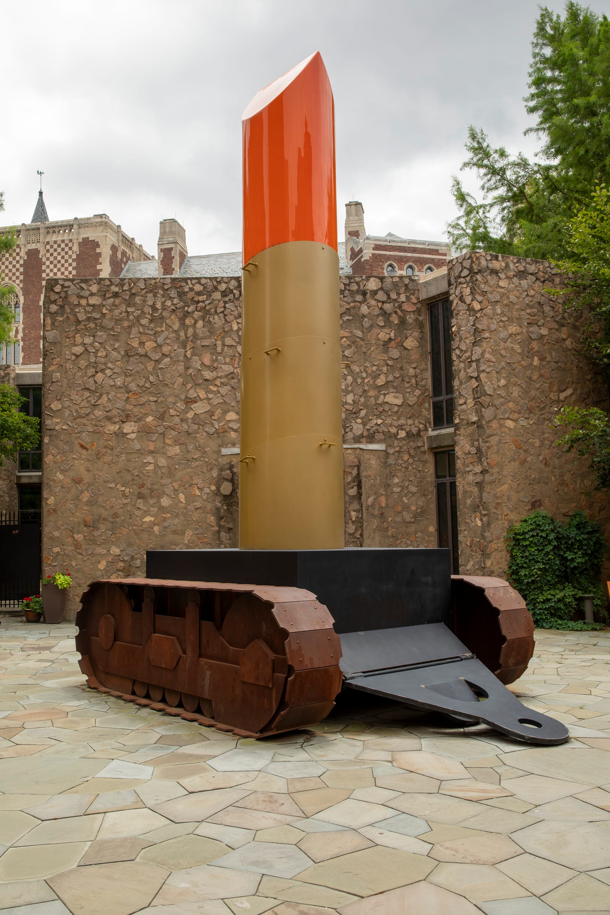 Oldenburg, who graduated from Yale in 1950, created the 24-foot steel sculpture in collaboration with a group of the university's architecture students as a surprise gift to the school in 1969 — the same year the school began accepting women to study. It was originally installed with an inflatable lipstick crayon at the university's Beinecke Plaza to serve as a speaking platform during a series of anti-Vietnam War protests, but after severe vandalism, Oldenburg and the students removed and refabricated it for durability before giving it back to Yale.