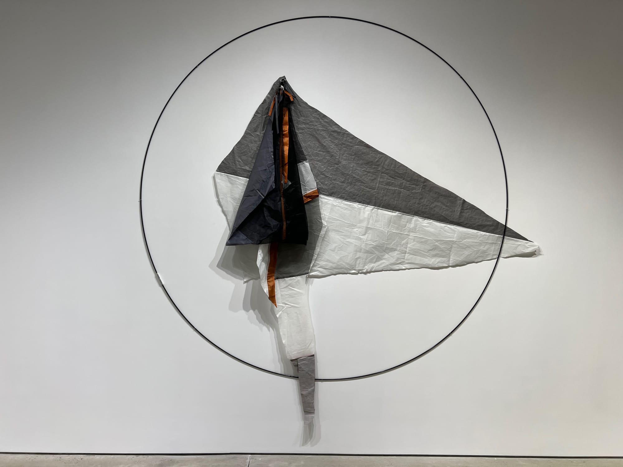 This passage seems relevant to Fields’s art. While the forms are grounded in specific locations and things (Standing Rock, a flag, a landscape, the pump jack), they are not merely vessels of meaning, but rather seem transformed by everything around them. Forms float and move, but they don’t break free or out of their carefully organized space, all receding from the edge of the canvas and revealing something in the background. This brings up another aspect of many of the works on display, which is the centralized imagery in the paintings and the ubiquity of circles or circular motion. Is the Osage shield the basis of these forms? Do they represent something else? In “Tent Metaphor (Ellipse)” (2017), the salvaged tent hangs in the middle of a circular frame, with one flap outstretched beyond the circle, like an overambitious Vitruvian Man.