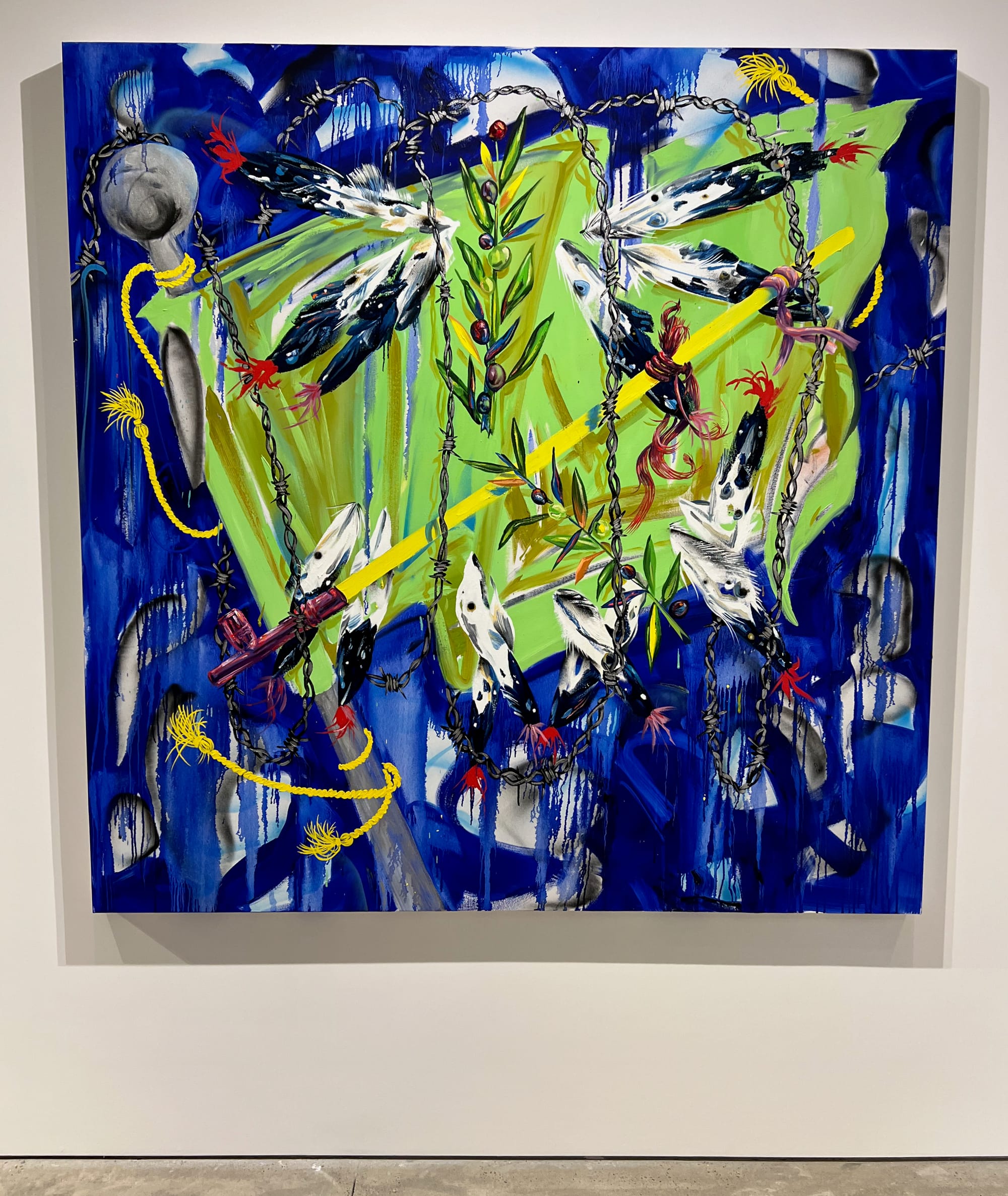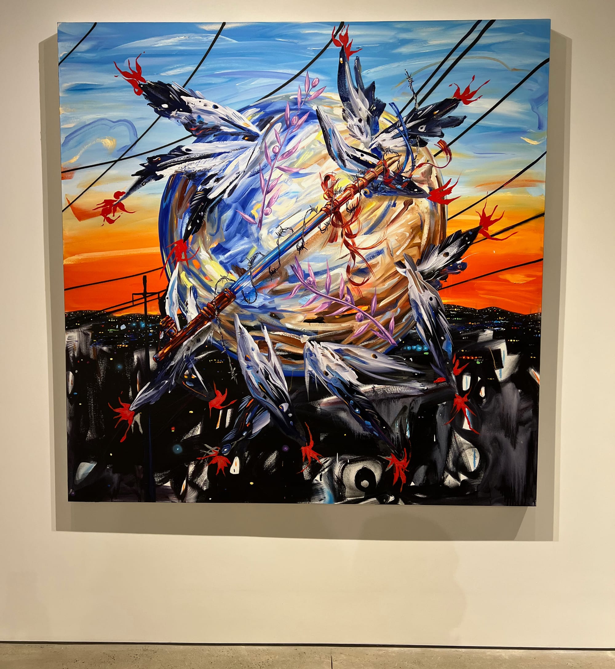 In “Osage Shield: Horizon, Tethered Nations” (2021), Fields has turned the Osage shield into a ball of energy, as the feathers hanging from the shield appear to swirl out of control. The olive branch, drained of its color, has started to disappear and the peace pipe is wrapped in barbed wire. In the background is a glowing cityscape at sunset; power lines crisscross above, slicing through the clarity of the sky. The pipeline protests are suggested in the power lines, which were built to quench the continuing thirst for more energy to fuel cities and industry across the United States. Fields turns to abstraction at the bottom of the work, as the fabric of the built world below is tumultuous and unstable. Is the central form trapped in the power lines? Is it transforming into something new?