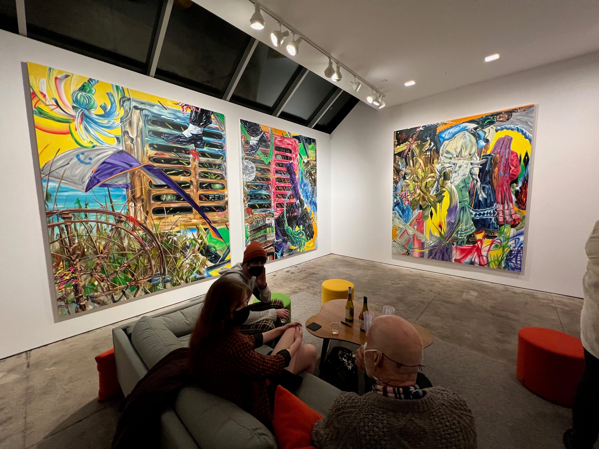 In the gallery’s back room is a triptych by the artist, “Chasm of Hope” (2022), which he painted over the course of a few weeks in New York City. It mashes together the city’s Central Park horses, sewer grates, graffitied walls, Wall Street bull, and other oddities into a brash and colorful series of works that remind me of Max Beckmann’s most ambitious triptychs. Like Beckmann, Fields appears not only to be rendering the world through metaphor or symbols, but to be creating a new cosmology that feeds his art. Beckmann once said, “Art is creative for the sake of realization, not for amusement: for transfiguration, not for the sake of play. It is the quest of our self that drives us along the eternal and never-ending journey we must all make.” Like Beckmann, Fields doesn’t conflate art with entertainment. He also refuses to settle on what it is, preferring to open up to the possibility that our lived experiences will transform what we see, while acknowledging that the journeys we take are never alone, even if the through lines are sometimes hard to pinpoint.