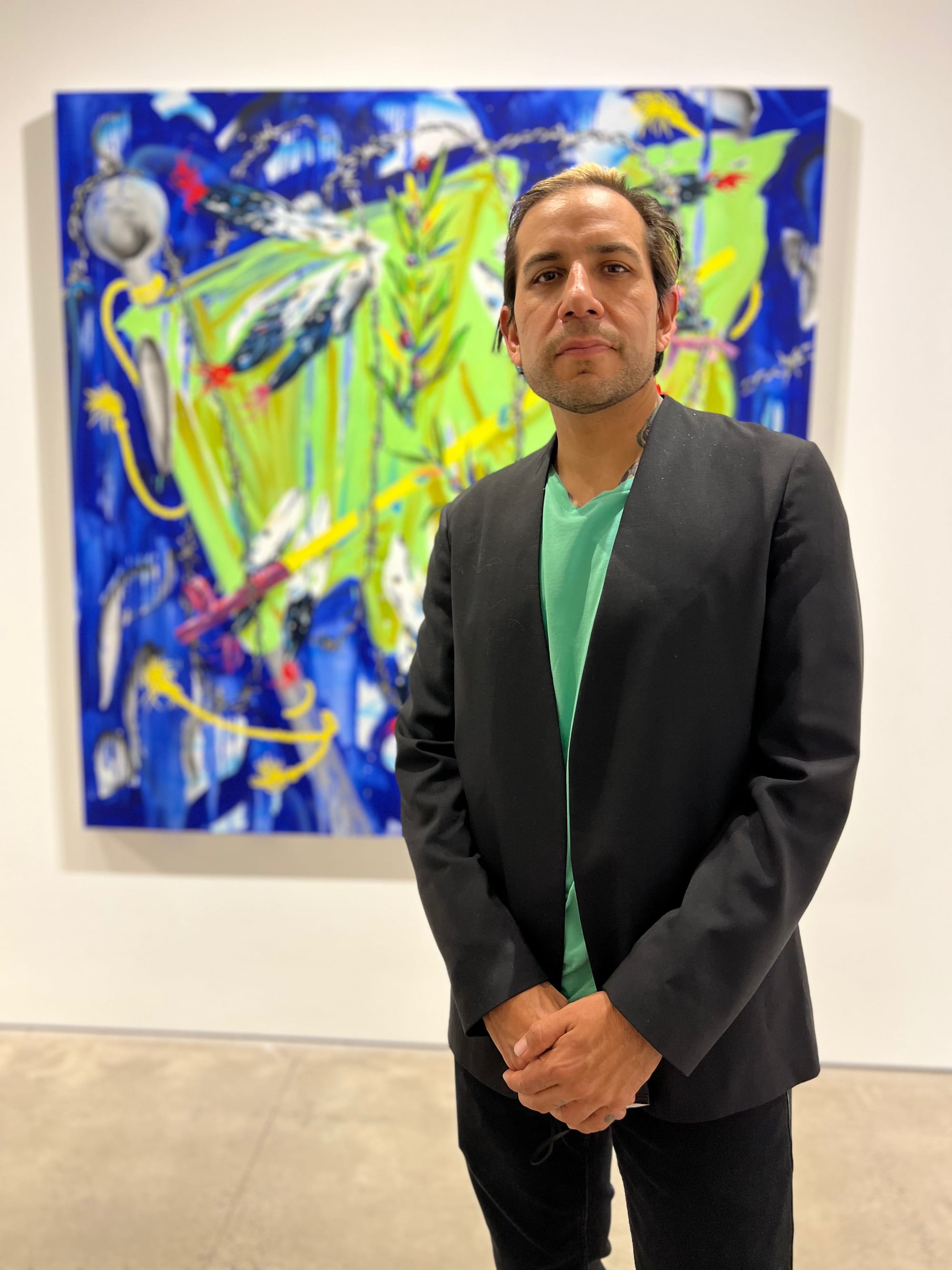 In the bodies of work on display, Fields has revisited that tumultuous period of Standing Rock. For his Tent Metaphor series, he salvaged the tents destroyed in raids by the authorities and pipeline security teams. He turned forms that are clearly marked with their history into hanging geometric sculptures that evoke hides, carcasses, or even flags or pennants. These works are showcased like trophies symbolizing accomplishment, not remnants of a catastrophe or violent invasion. The paintings in the exhibition mostly focus on a more recent political history, the January 6 insurrection, highlighting the savagery of American settlers against not only Indigenous groups but even their own state when it questions what they perceive as their rights. In both bodies of work, Fields uses the forms and symbols of the Oklahoma flag and its associated Native American imagery to thread a connection between all that we see.