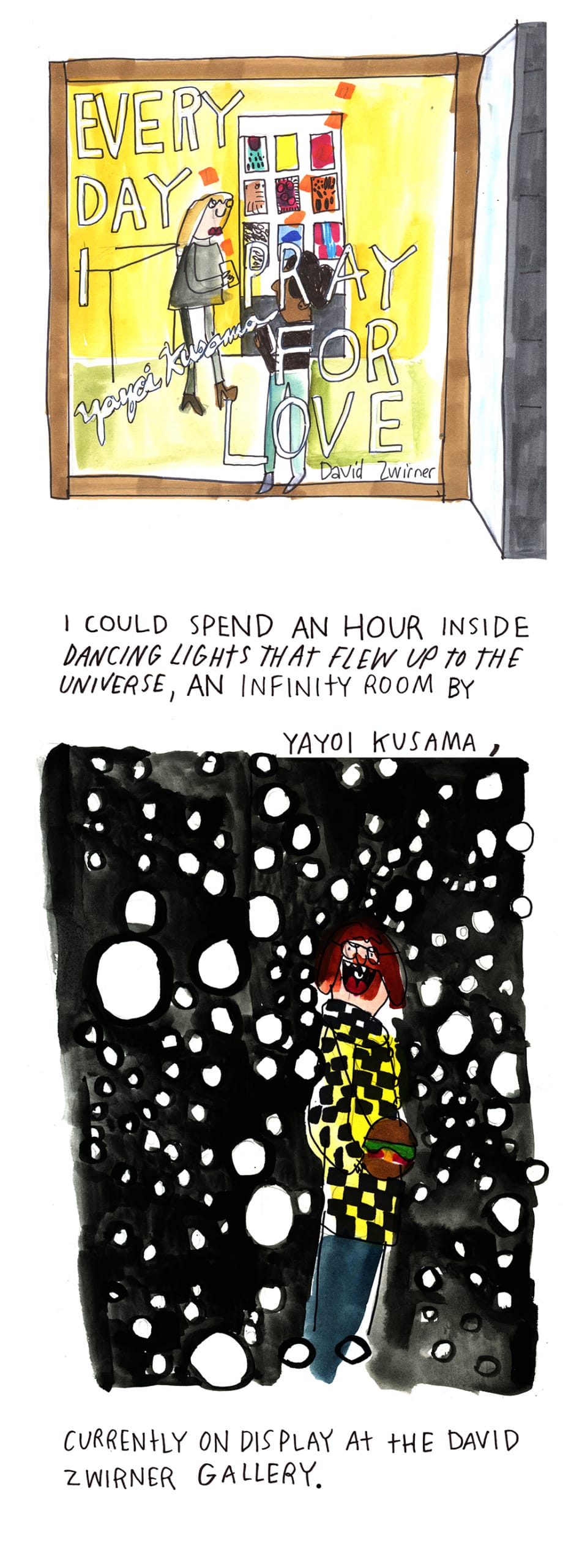 Yayoi Kusama: EVERY DAY I PRAY FOR LOVE continues at David Zwirner (537 West 20th Street, Chelsea, Manhattan) through December 14.