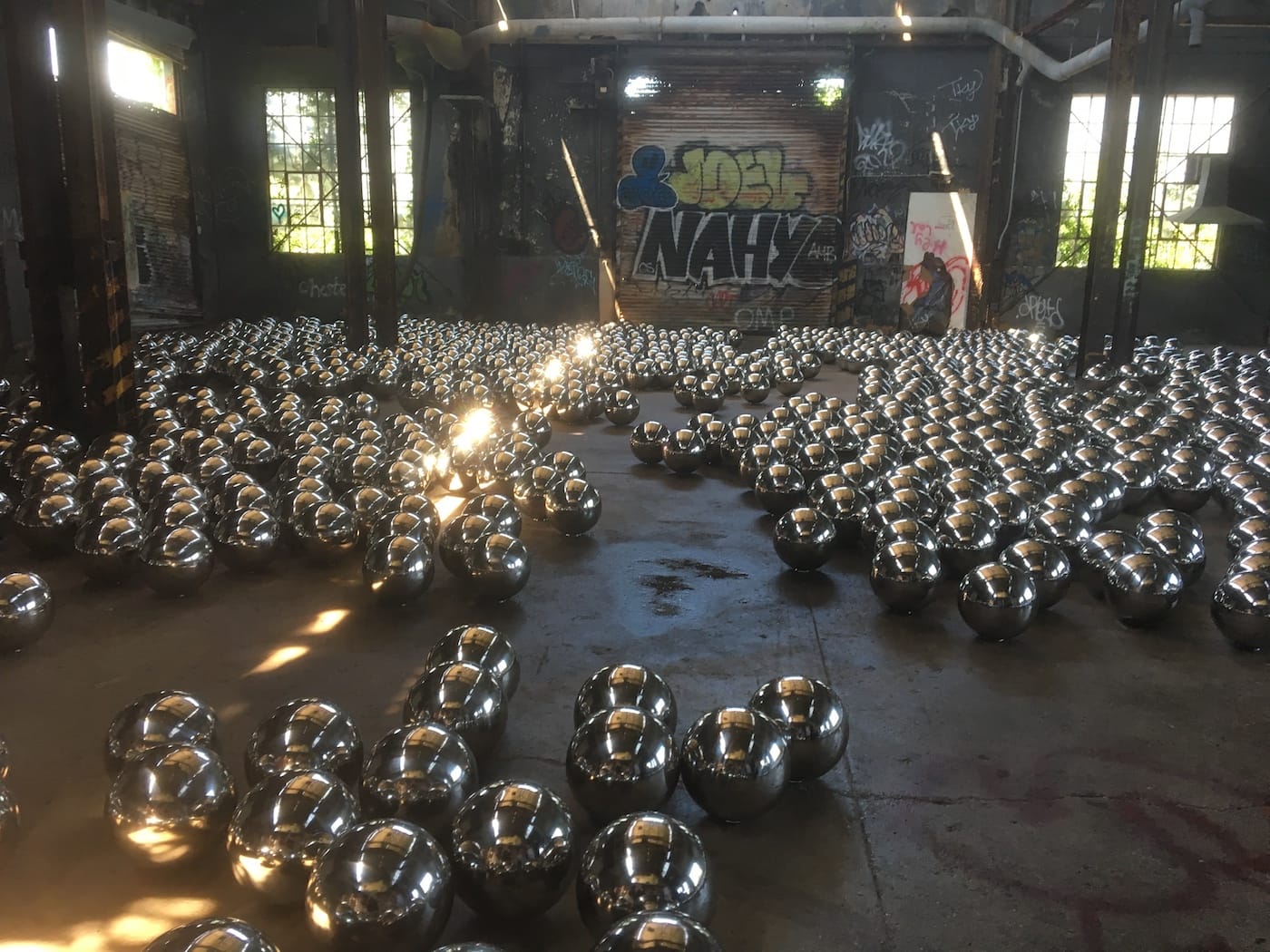 My most recent visit to the Rockaways was to experience Yayoi Kusama’s magnificent Narcissus Garden (1966-present) in a still intact if ramshackle former train repair facility, dating to the time when Fort Tilden, now part of the Gateway National Recreation Area, was still an active military installation. Kusama, now 89 years old and one of the most in-demand artists anywhere (although this was hardly the case for years and years), has installed 1,500 mirrored stainless steel spheres on the floor of this vulnerable building, one of many structures in the area walloped by Hurricane Sandy. They gleam, and glint, mesmerizing and even magical. Reflective to the extreme, they show your image but also everything else, including other visitors, the vicissitudes of daylight, the surrounding architecture, and bits of the sky, which is visible through holes in the roof.