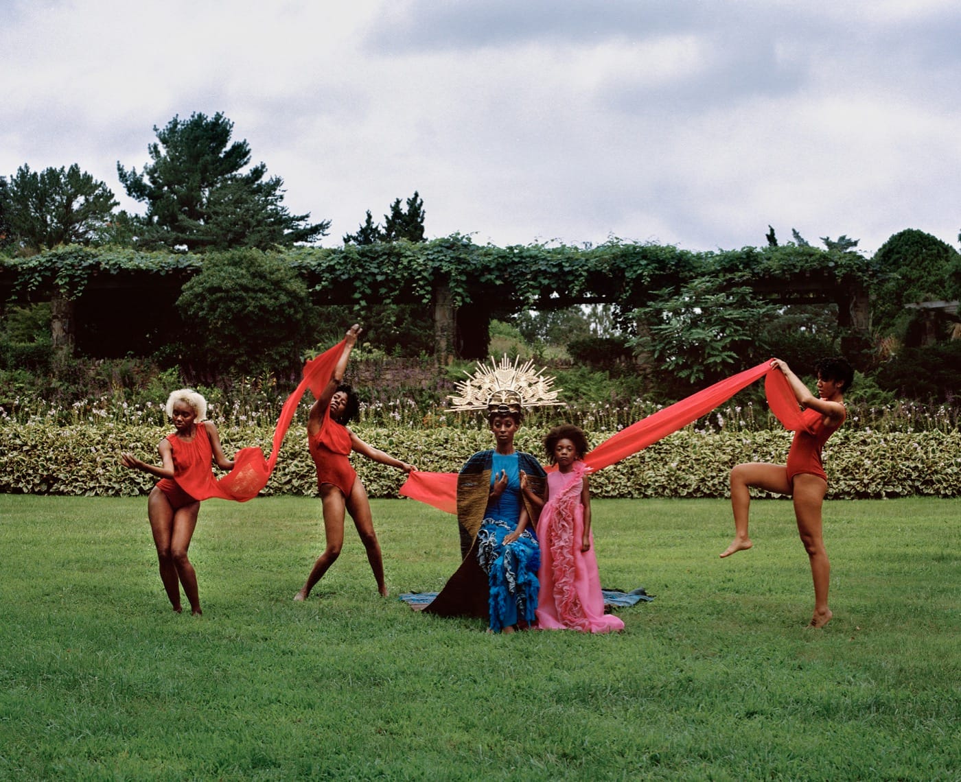 The loa of Ezili Dantor comes into view in the piece, “Ezili Dantor: Freedom and the African Diaspora: We are here, because you were there” (2018). Here the warrior is seated, with an elaborate crown on her head, surrounded by her children who dance in celebration of her. Here, the model takes on the role of Madonna, nurturing the next generation of fighters who follow the spirit of the African slaves in Haiti who forcibly took their freedom through armed revolution.