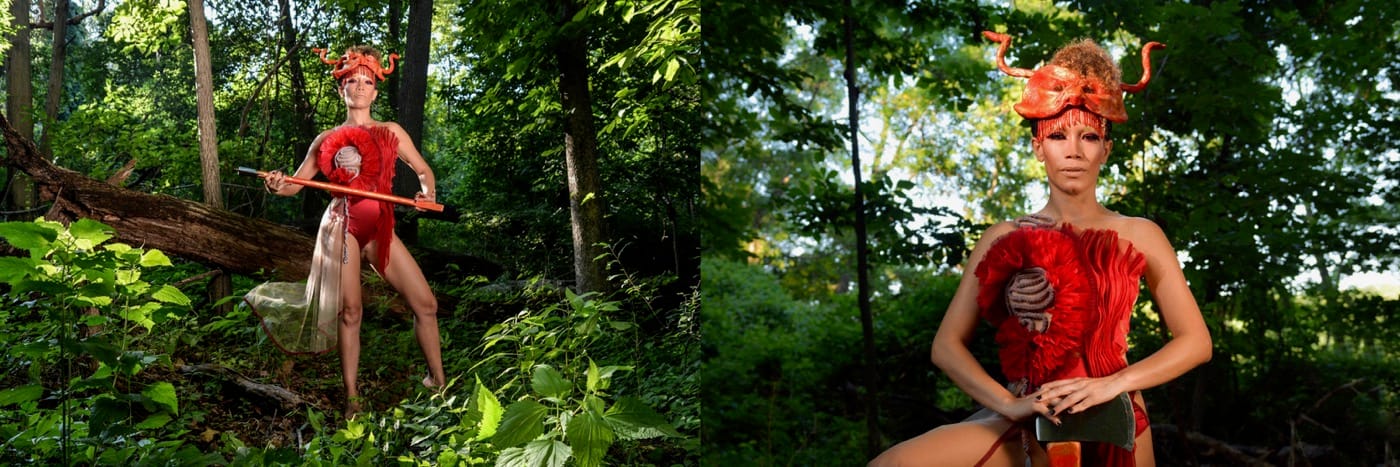 Rodriguez literally manifests this human mutability through mask making, performance, and photographic documentation of these performances, which draw on her study of the loas (or spirits that function as intermediaries between humans and a supreme creator) of Haitian Vodou and the Orishas of Santeria. In her exhibition Chronicles: We are here, because you were there at the AAA3A gallery, Rodriguez features women she knows personally, such as the Afro-Dominican singer Carolina Camacho, who becomes the Shango Orisha of thunder and lighting and drum. In the piece “Shango: We are here, because you were there” (2018) Camacho appears in a red leotard with ruffles and ornamentation, holding a red axe, and wearing on her head a beaded red helm — an outfit that imparts to the viewer that she is a warrior, but she conducts her campaigns through song and the music of the drum. In the gallery, that red mask with its hanging beads and curved horns sits on a small pedestal.