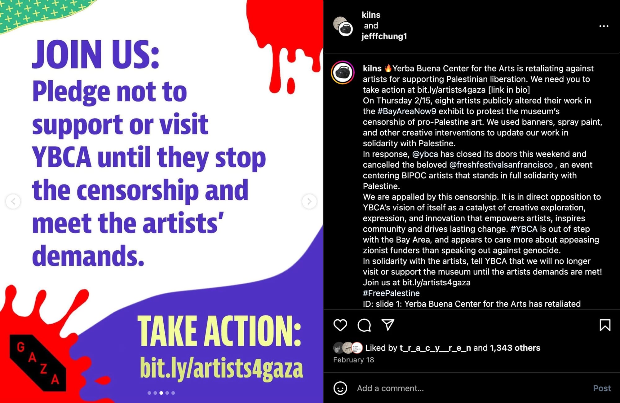 Fenske Bahat's departure follows weeks of turmoil at the center. After artists Jeffrey Cheung and Lukaza Branfman-Verissimo alleged that YBCA prevented them from advocating for Palestine in additional projects for the Bay Area Now 9 exhibition, eight artists in the show altered their own artworks with pro-Palestine messaging during a February 15 event at the Center. They also distributed flyers and called for an "end to YBCA’s censorship of artists" and "the removal of Zionist YBCA funders and board members."