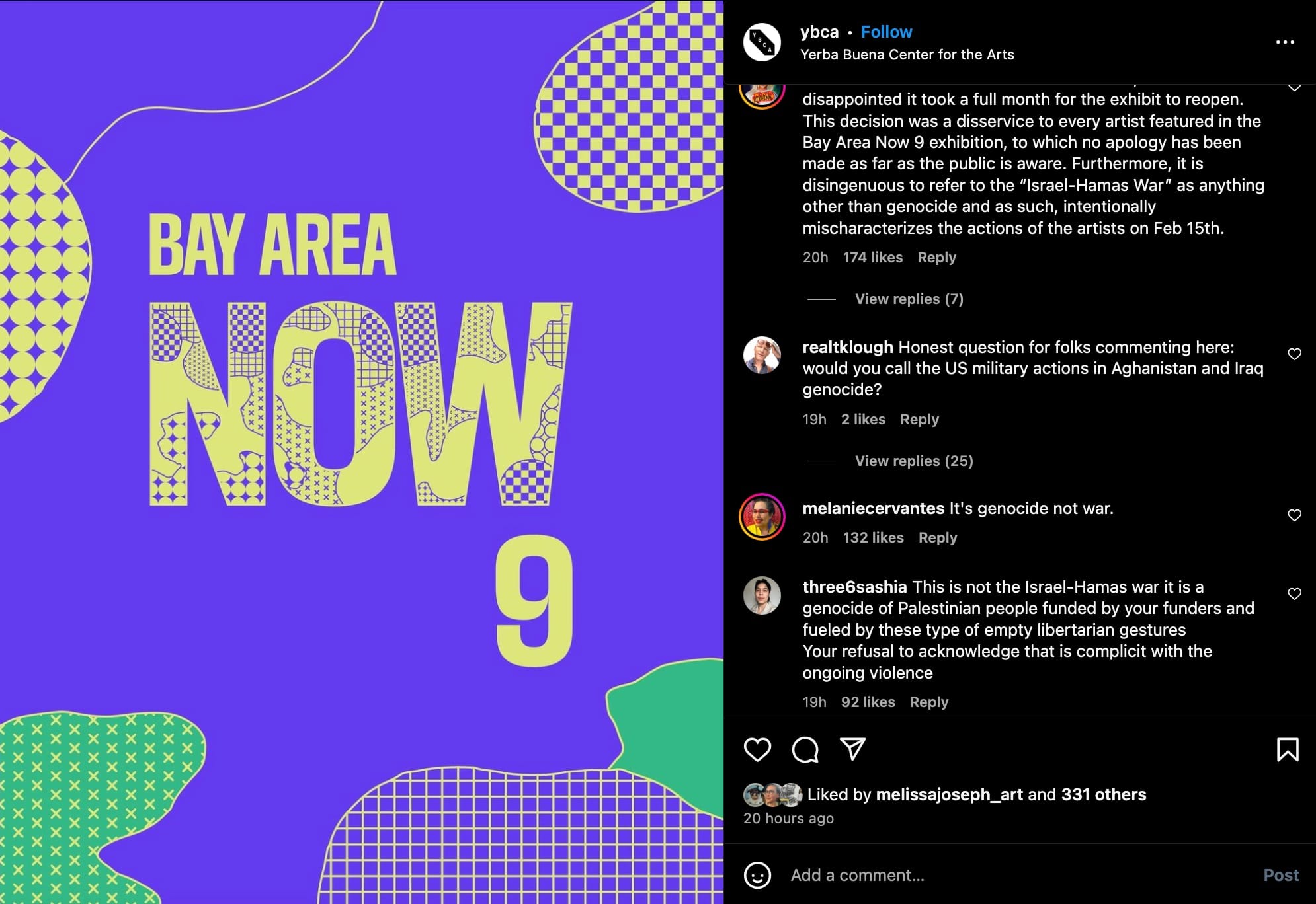 "You can see in the comments on that post, that the Bay Area stands with us," Paz G. told Hyperallergic. "It's not even just about standing with us, it's that this institution belongs to the Bay Area as it's publicly funded by the city of San Francisco. YBCA still hasn't apologized, and I think the community wants an apology and deserves an apology for the Center closing down for an entire month."