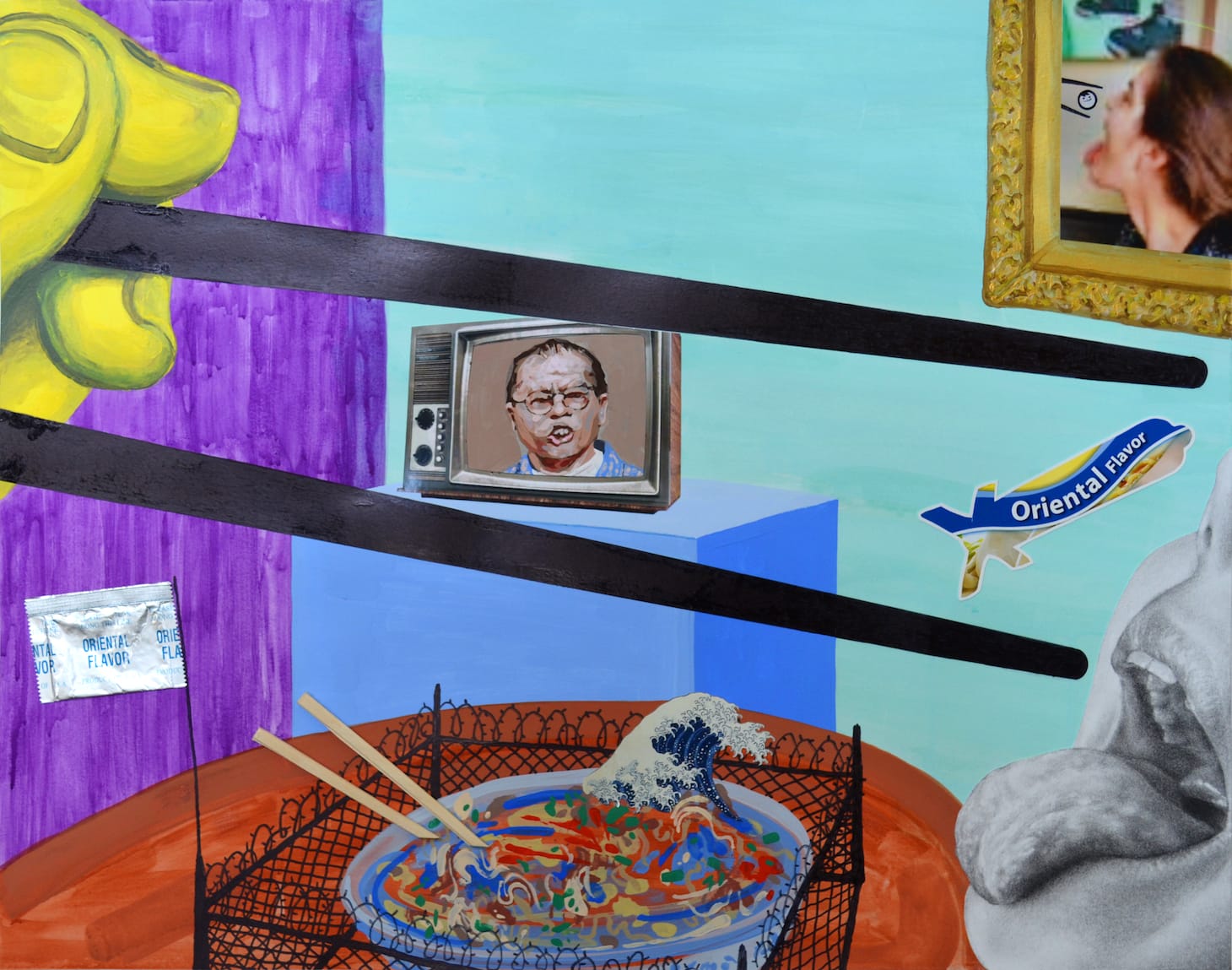 In “Oriental Flavor” (2019), actor Mickey Rooney, who seemingly enjoyed playing the racist stereotype of a bucktooth Japanese character, Mr. Yunioshi, in the film Breakfast at Tiffany’s (1961), is seen on the screen of an analog television, glimpsed between two black chopsticks. On the table we see a bowl of soup and noodles surrounded by a barbed-wire fence. A recurring motif in Gu’s work, Hokusai’s “Great Wave” rises out of the soup, suggesting an inescapable cataclysm is approaching. Condiment wrappers with the words “Oriental Flavor” are affixed to the scene.
