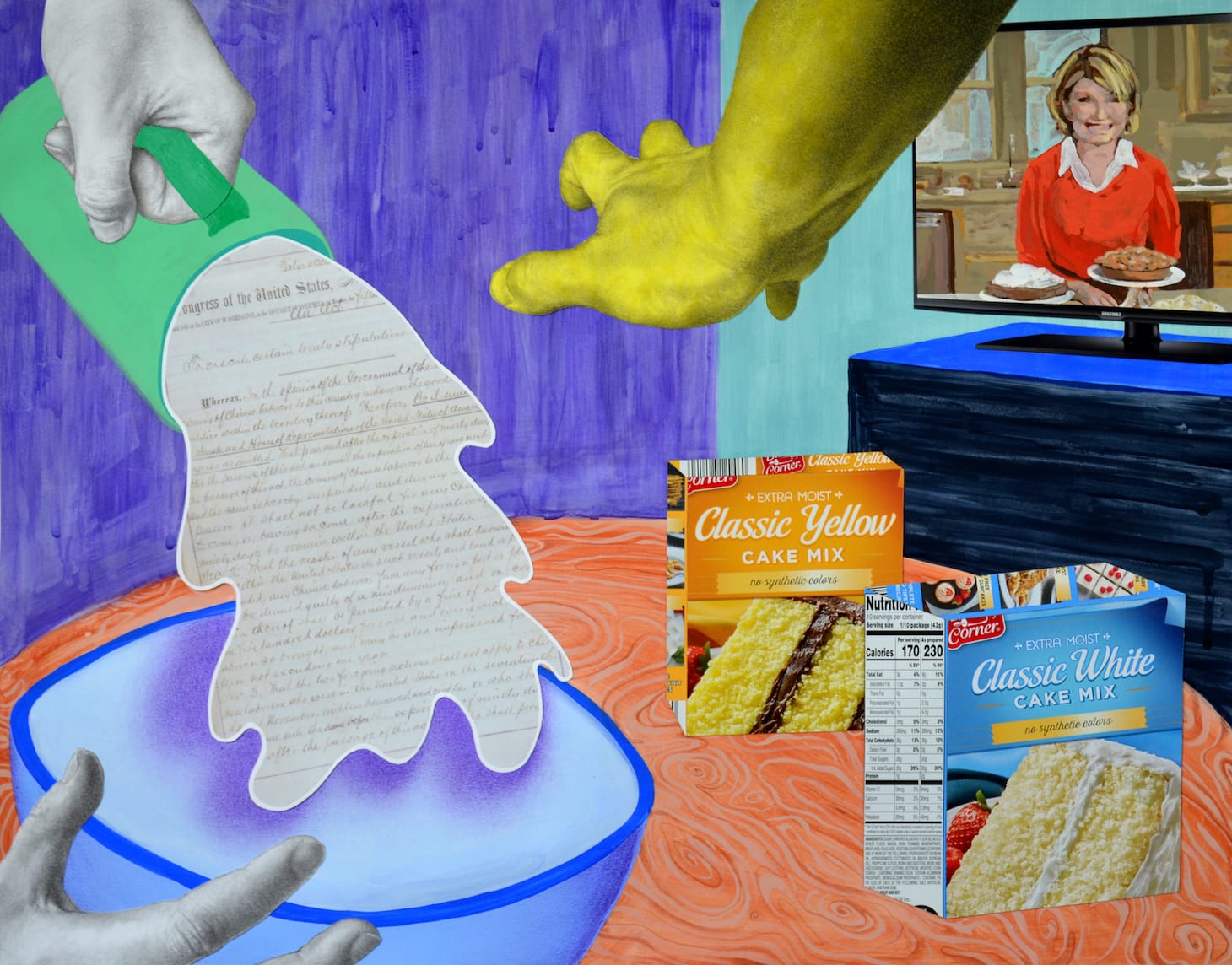 In “No Synthetic Colors” (2019), we see the hands of two people making a cake. The printed images of two white hands pour “flour” into a bowl; the flour is composed of a cutout shape containing the first page of the United States Congress’s declaration of the Chinese Exclusion Act (1882). A yellow arm reaches in from the top edge. Two boxes of cake mix with “no synthetic colors” — Classic Yellow Cake Mix and Classic White Cake Mix — are on the table beside the bowl.